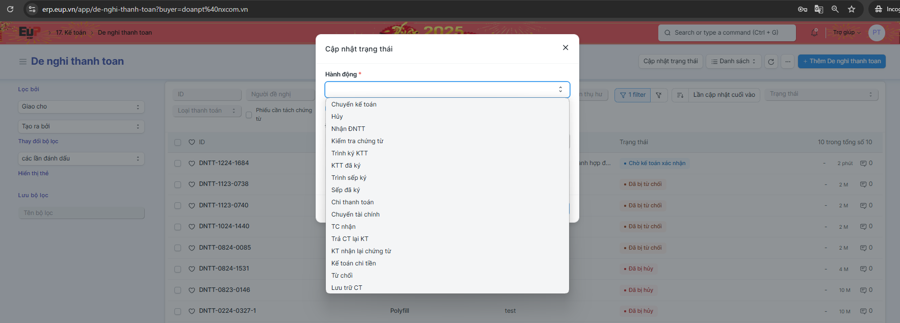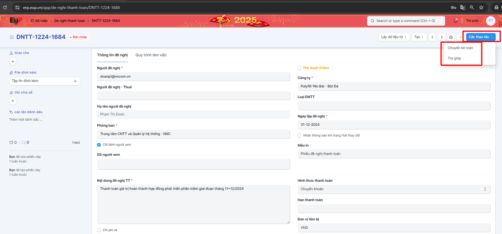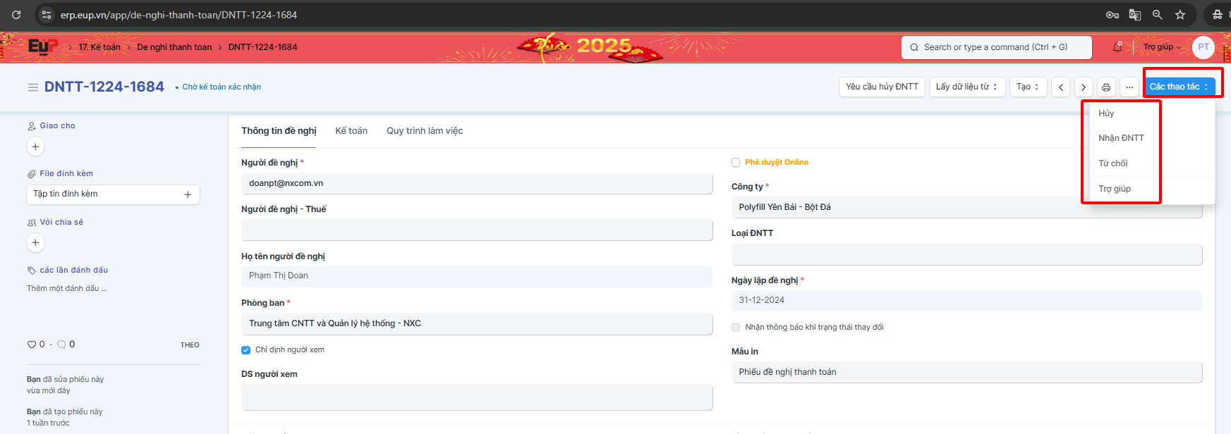 Kế toán khi nhận được bản cứng ĐNTT có thể bấm mở phiếu ra để chọn bấm vào hành động tương ứng với mục đích, vai trò và phân quyền của mình: