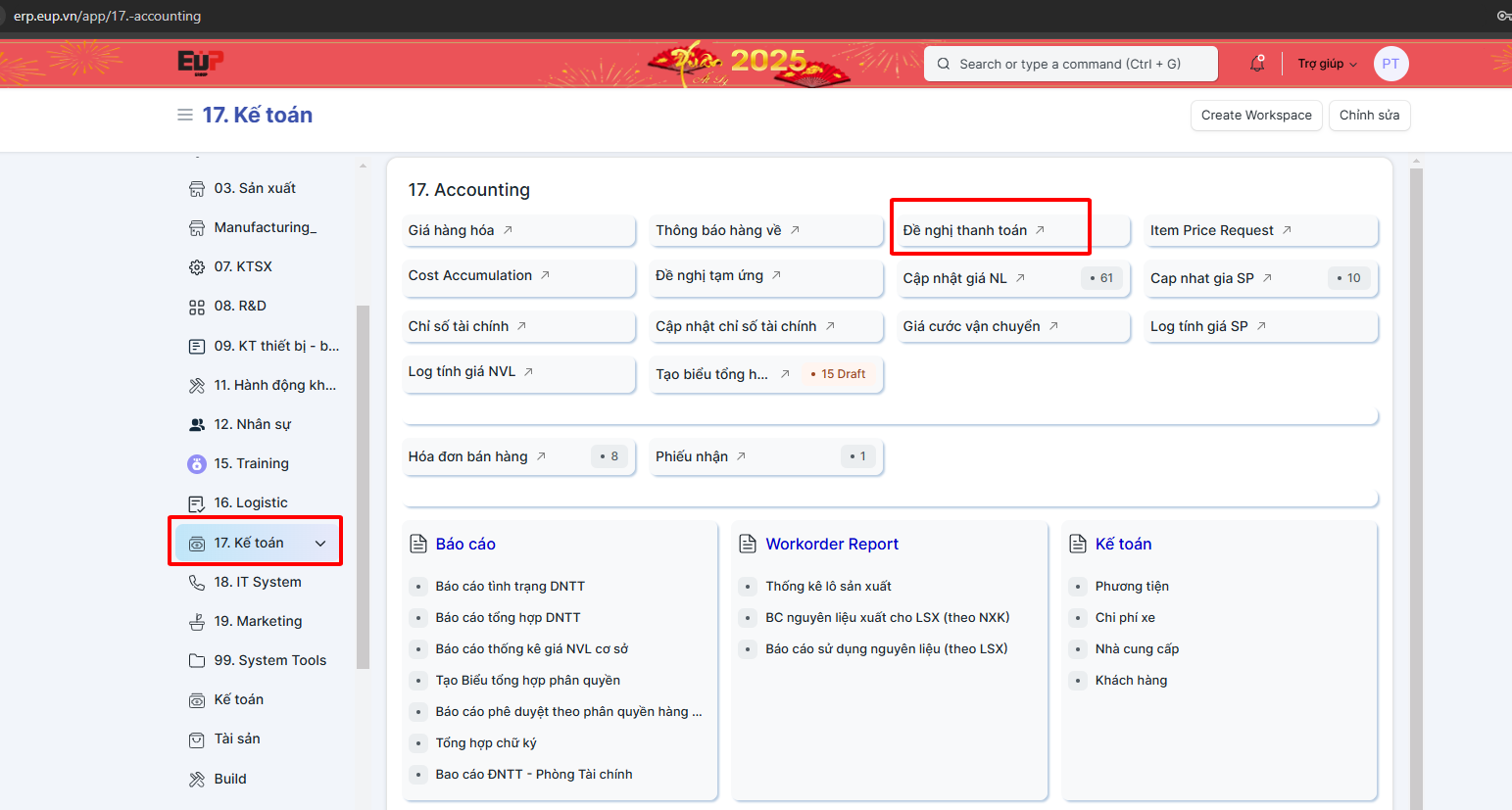 Bước 1: Trên trang chính vào mục 17. Kế toán => chọn Đề nghị thanh toán => bấm Thêm đề nghị thanh toán: