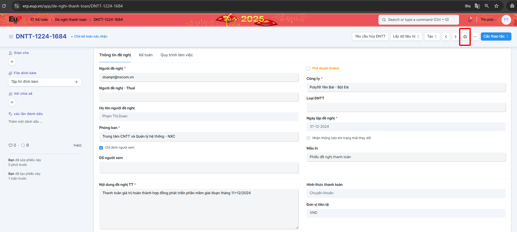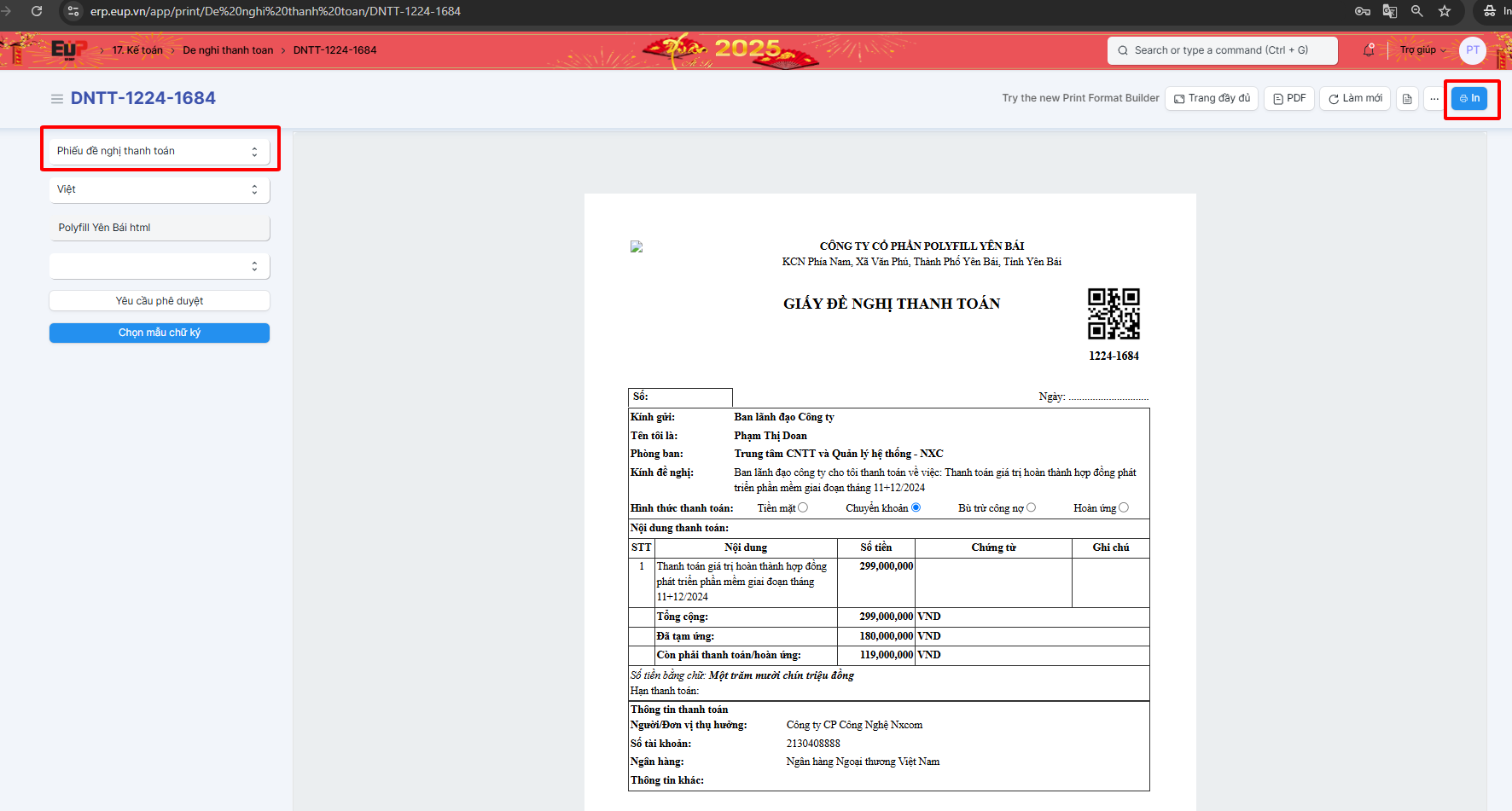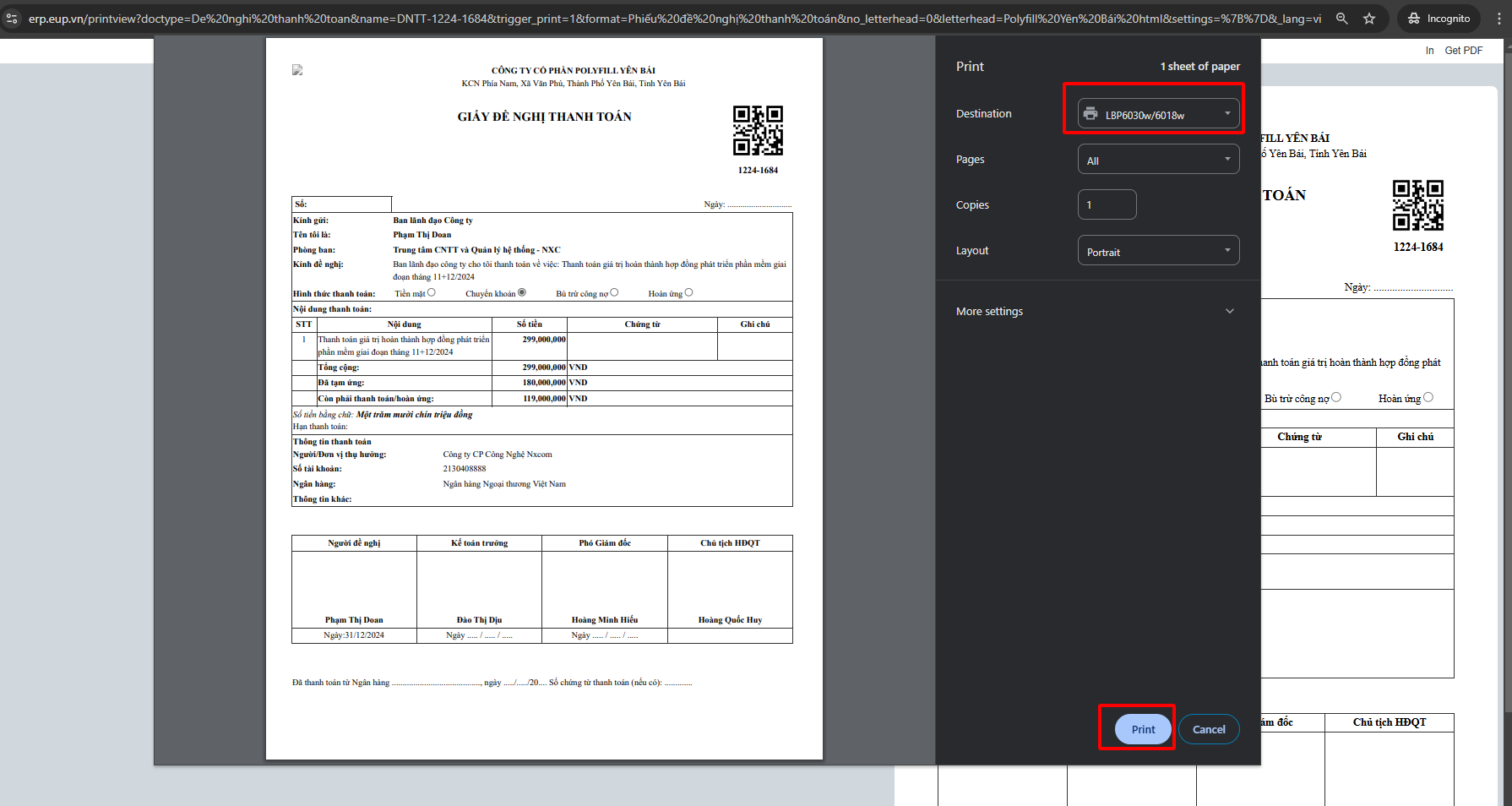 Mở Đề nghị thanh toán cần in => Tích biểu tượng máy in => Chọn định dạng bản in => Tích vào “In” => Chọn máy in => Chọn “Print”