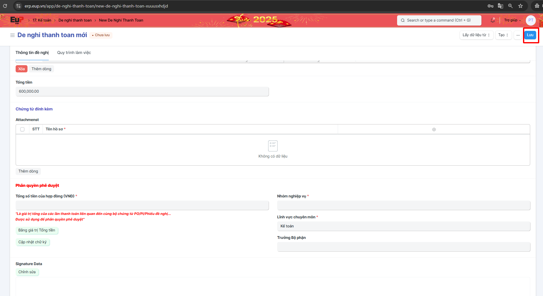 Bước 5: Sau khi điền đầy đủ các thông tin tích vào “Lưu” để lưu Đề nghị thanh toán => để chuyển sang các bước tiếp theo