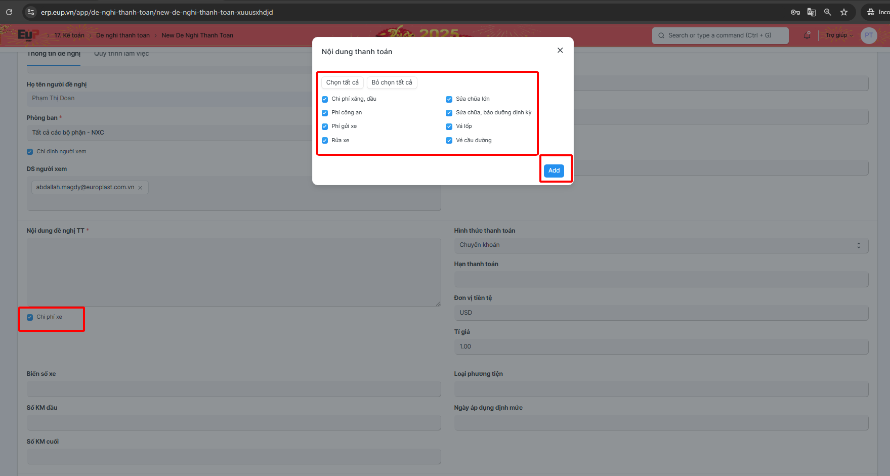 Chi phí xe: Tích vào đây và chọn các chi phí xe cần thanh toán nếu làm ĐNTT cho các chi phí xe (xăng dầu, cầu đường, công an, gửi xe, rửa xe,...)