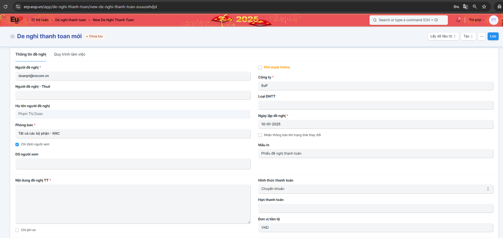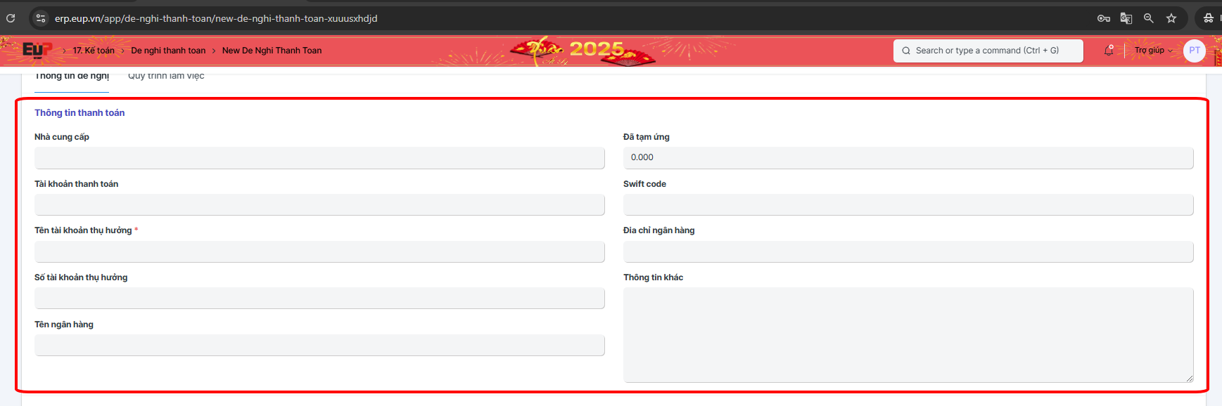 Hạn thanh toán: Chọn 1 ngày sau ngày làm đề nghị thanh toán là thời hạn cần thanh toán;