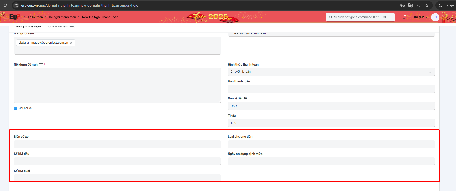 Điền các thông tin xe nếu làm ĐNTT các chi phí xe: Biển số xe, Số KM đầu, Số Km cuối, Loại phương tiện