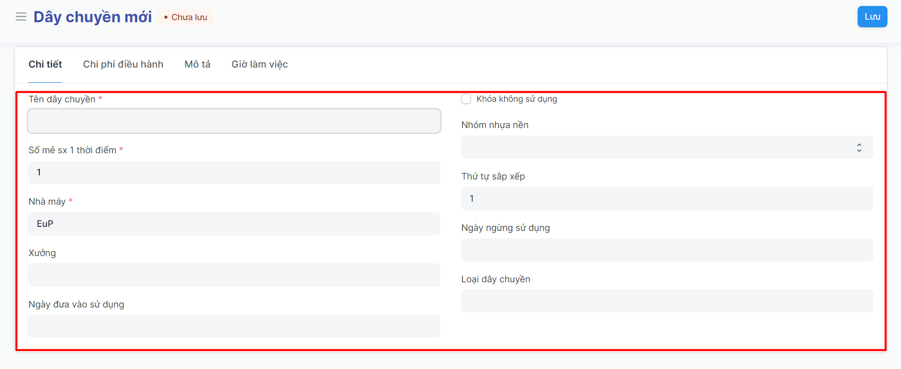 Xưởng: Nhập tên xưởng đặt dây chuyền;