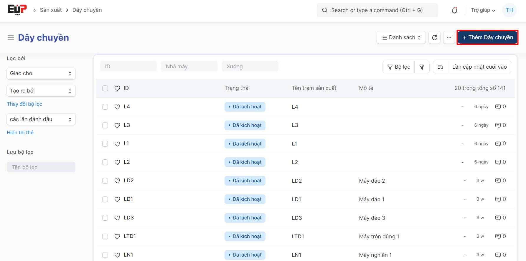 Danh mục Dây chuyền sản xuất là 1 chức năng trên hệ thống ERP dùng để tạo và lưu trữ các thông tin chung của dây chuyền sản xuất của các nhà máy;