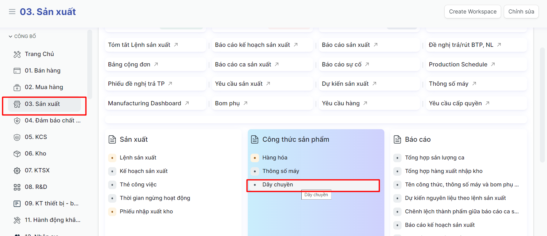 Bước 1: Truy cập vào chức năng khai báo Dây chuyền sản xuất theo đường dẫn: