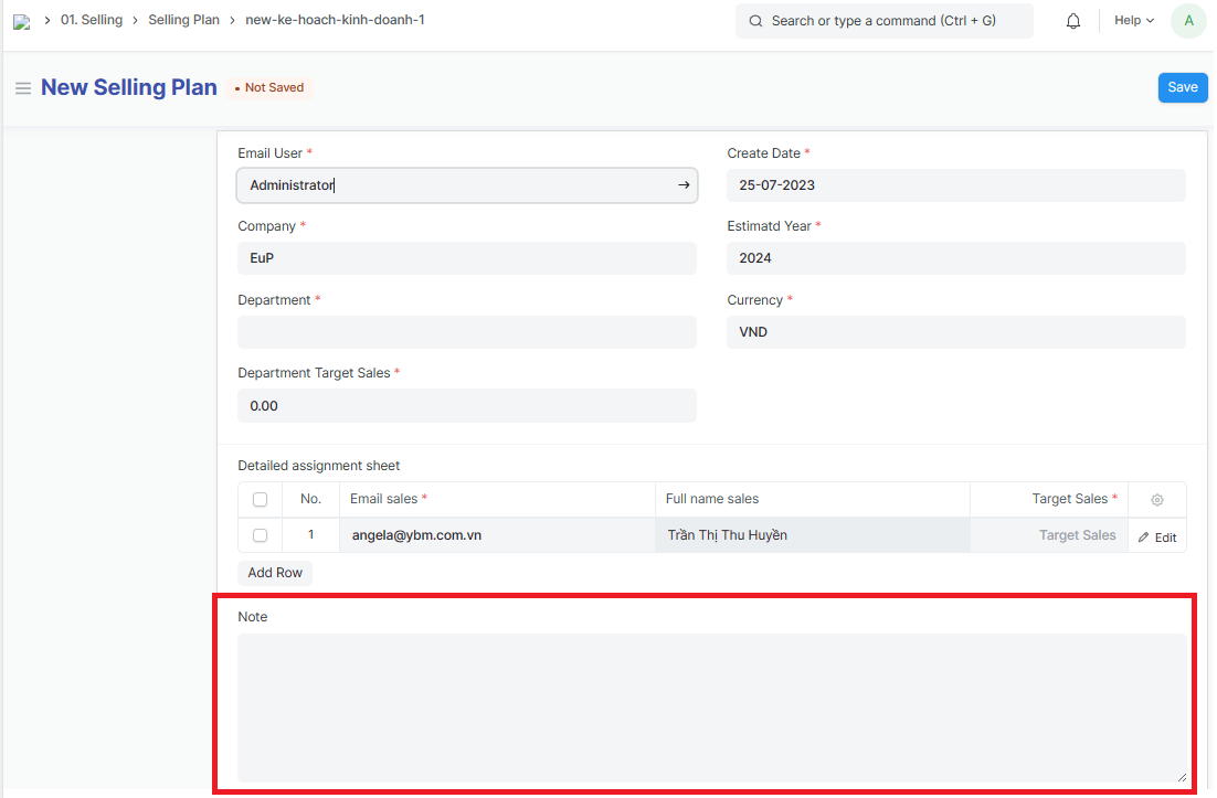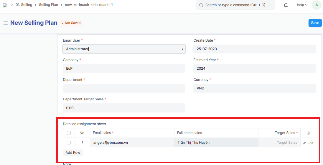 The Selling plan is made for 1 year, by department; The manager allocates sales to each salesperson in the department based on the total sales assigned;