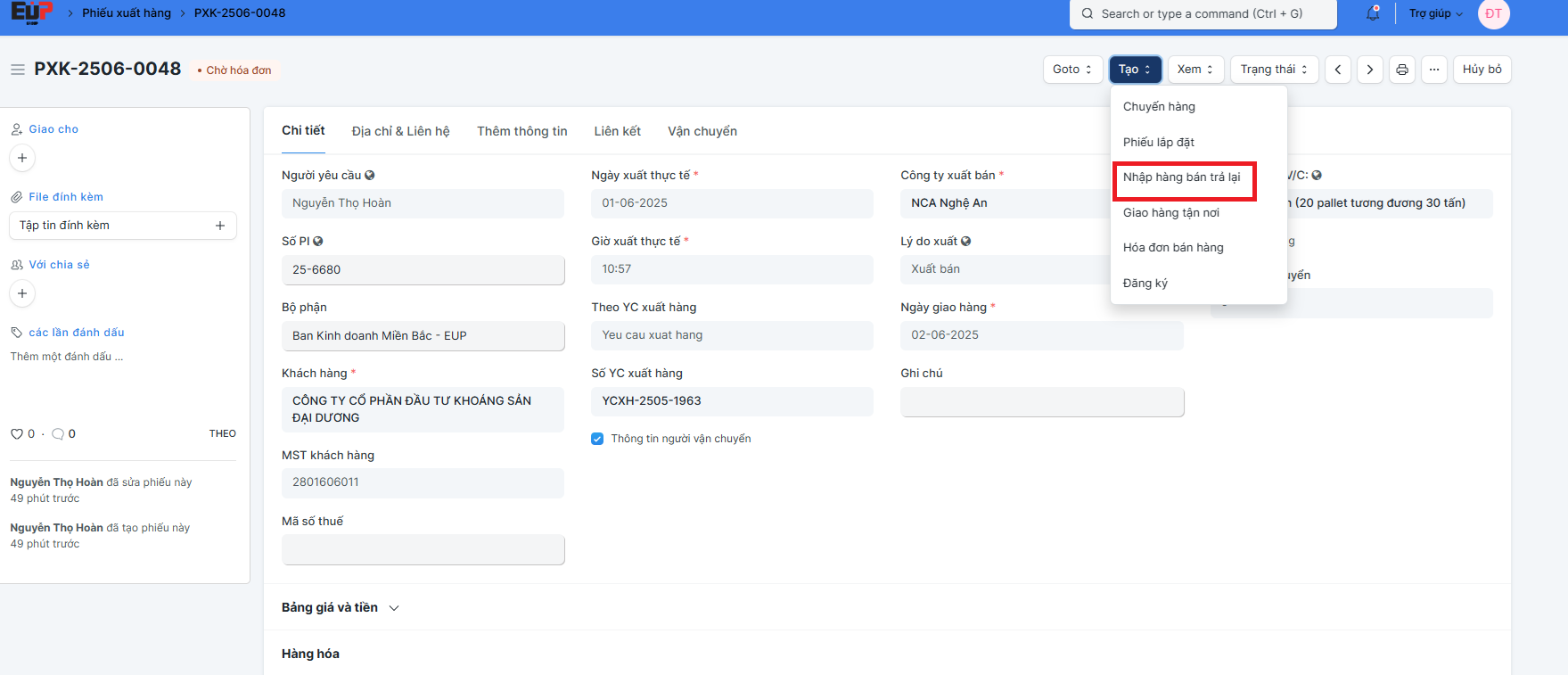 Bước 2: Tìm đến phiếu xuất hàng muốn nhập lại hàng bán bị trả lại. Click vào bên trong phiếu. Click vào biểu tượng " Tạo", lấy dữ liệu " Nhập hàng bán trả lại".