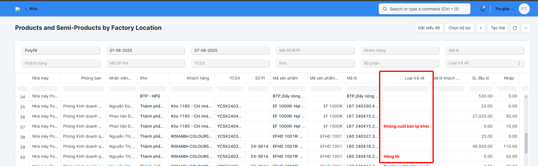 Khi chốt phiếu trả lại với các trường hợp có sinh mã lô mới, hệ thống sẽ tự động sinh và chốt phiếu nhập xuất kho để điều chỉnh số lượng của mã lô về giá trị đúng => Khi xem các báo cáo tồn kho sẽ có thêm cột "Loại trả về", các lô hàng trả về bất thường sẽ được hiển thị thông tin loại hàng trả về tương ứng và được tô màu đỏ (Báo cáo TP, BTP theo địa điểm nhà máy; Báo cáo sản phẩm theo vị trí, Báo cáo nhập xuất tồn theo khách hàng)
