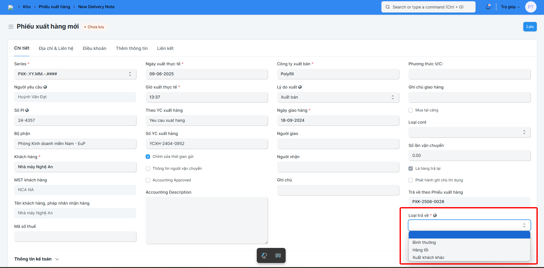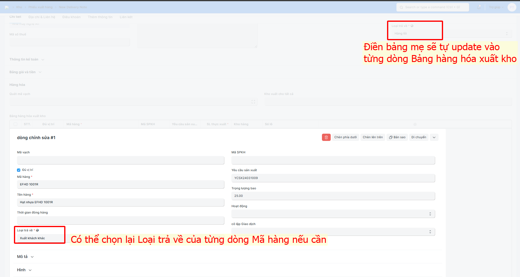 Bước 3: Chọn loại hàng trả lại bằng cách lựa chọn giá trị trong trường Loại trả về (Khi chọn giá trị ở đây hệ thống sẽ tự điền vào Loại trả về của từng dòng Mã hàng ở Bảng hàng hóa xuất kho (người dùng có thể sửa Loại trả về của các dòng Mã hàng nếu cần khi có mã hàng có Loại trả về khác giá trị điền bên ngoài):