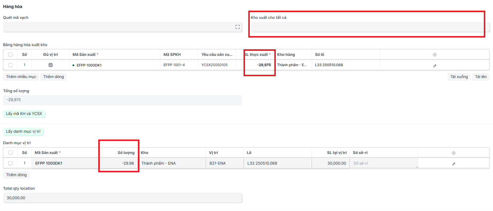 - SL thực xuất: Điền số lượng hàng hóa nhập về, chú ý điền giá trị âm