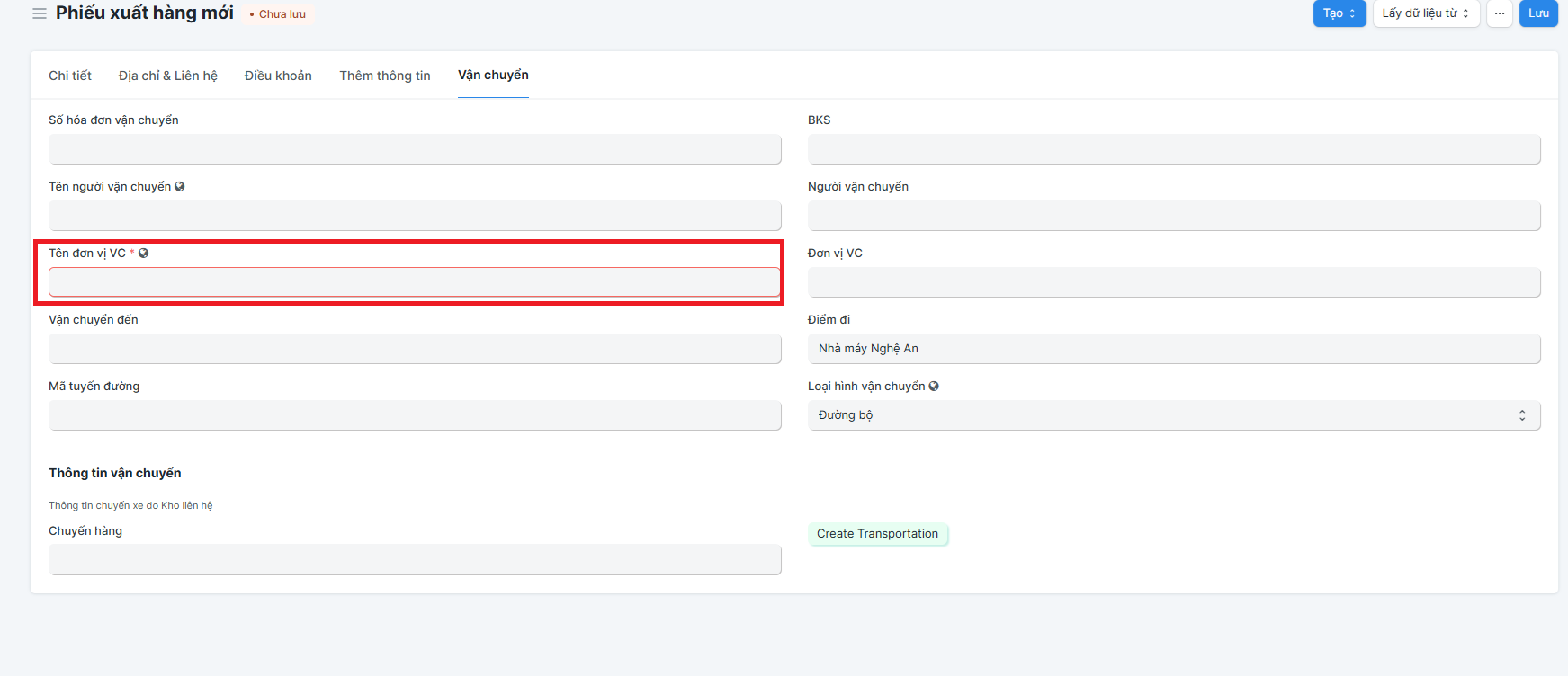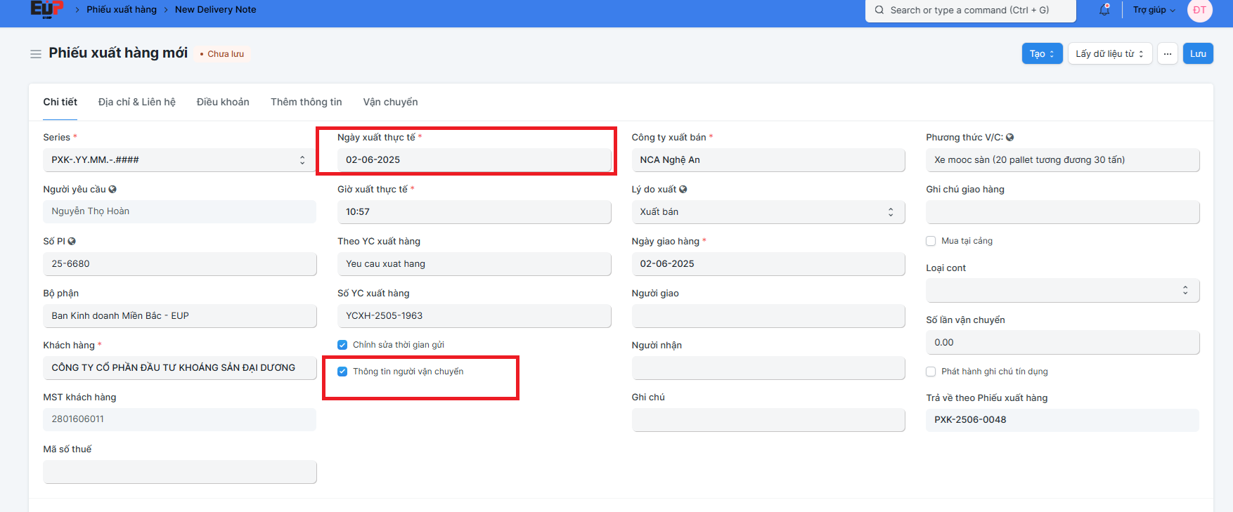 Bước 4: Chỉnh sửa ngày nhập hàng về. Nếu có tích vào " Thông tin người vận chuyển", thì phải điền tên đơn vị V/C ở tab "Vận chuyển"