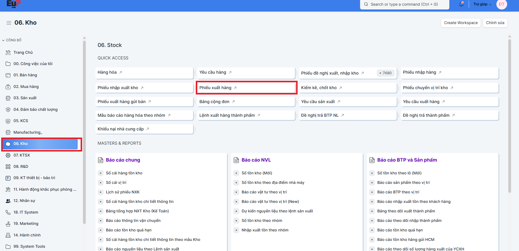 Bước 1: Đường dẫn : Home-> Kho-> Phiếu xuất hàng