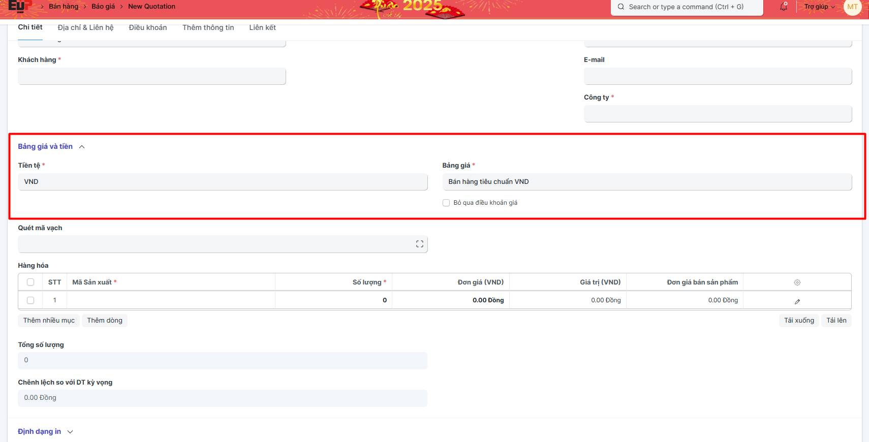 Bước 3: Nhập thông tin về đồng tiền trên báo giá:
