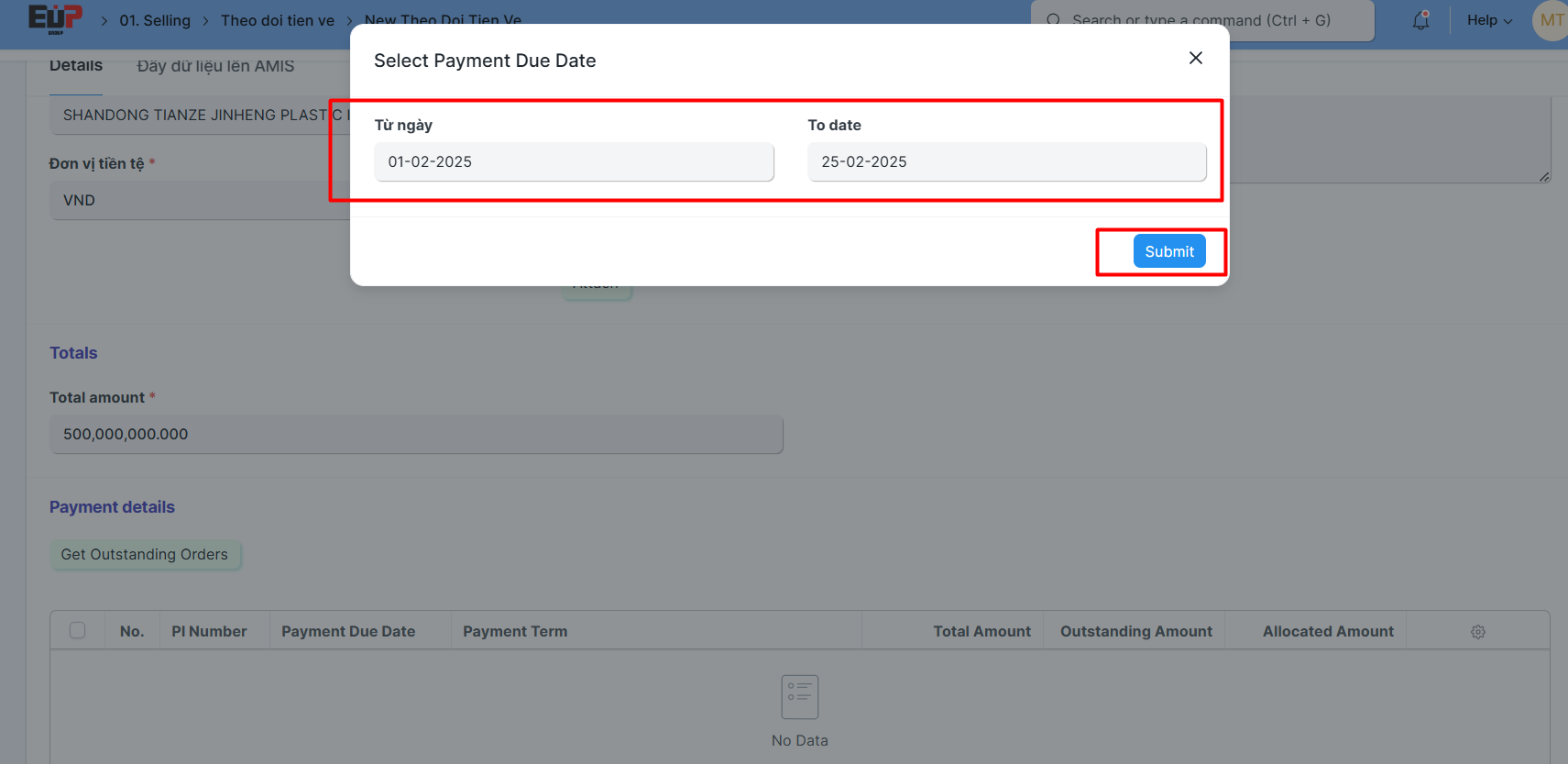 Bước 5: Nhập Số tiền được thanh toán; Bấm nút "Get Outstanding Orders" để lấy danh sách Đơn đặt hàng (PI) chi tiết: