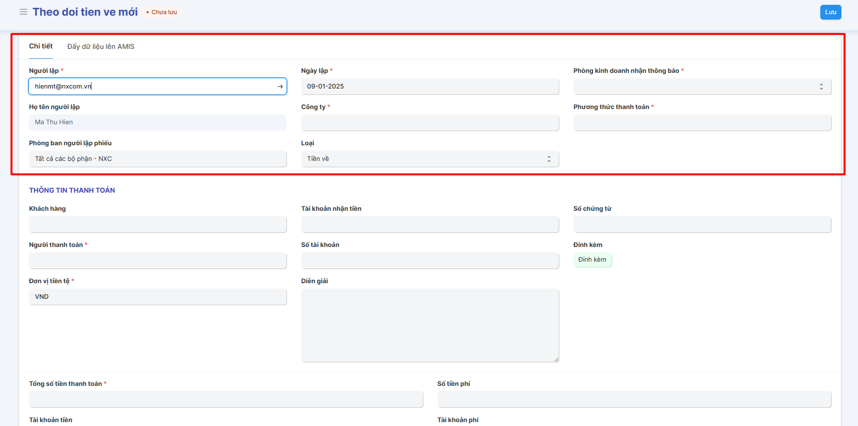Công ty: Chọn Công ty nhận được tiền về