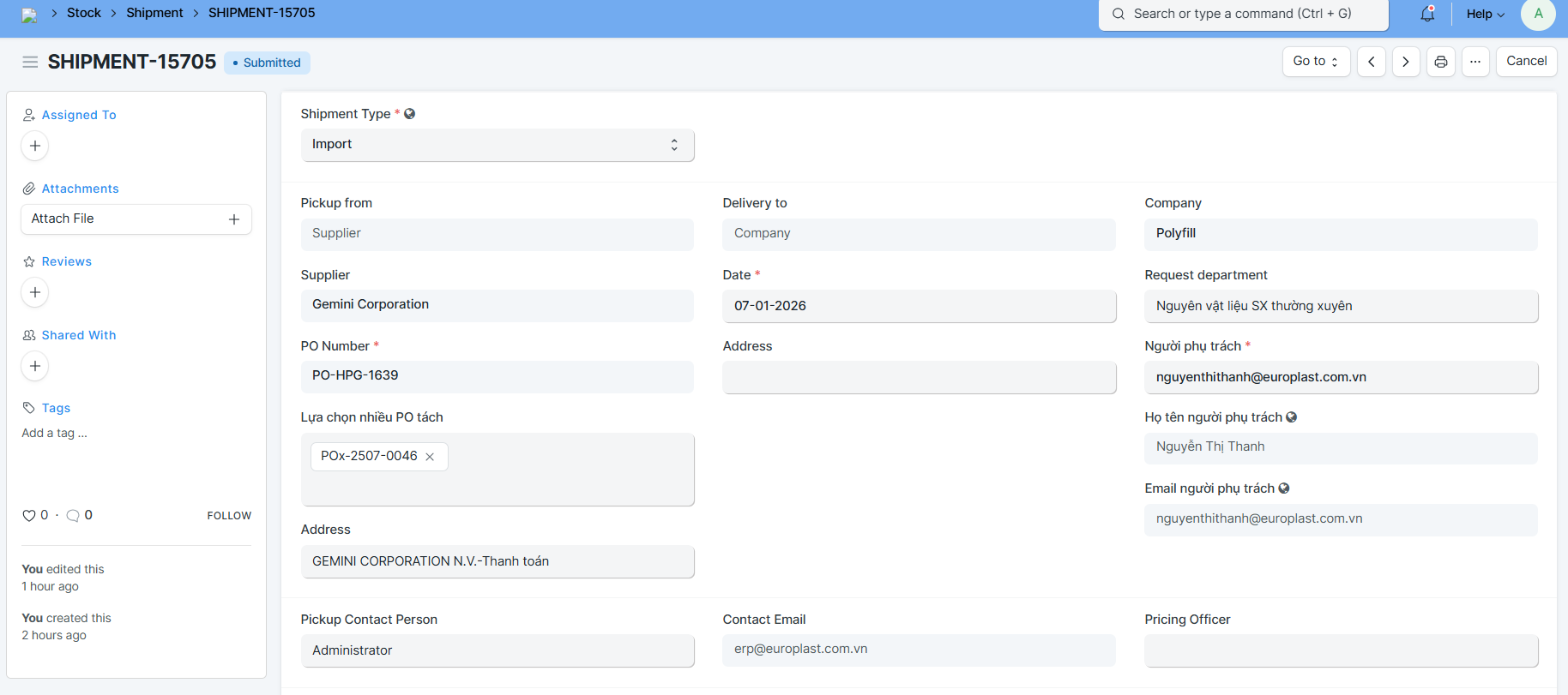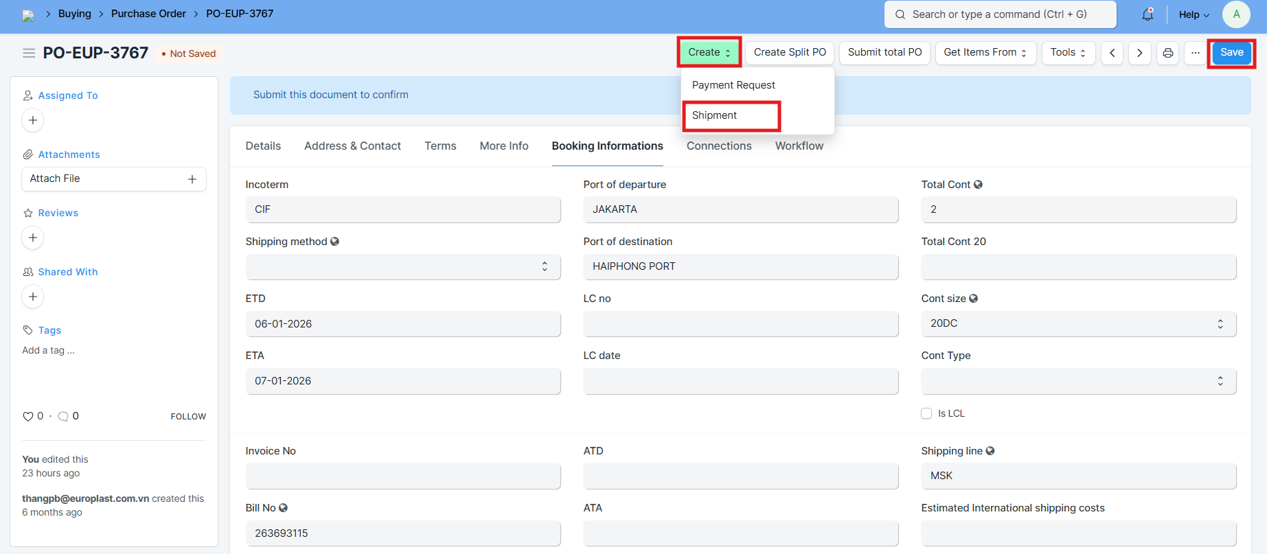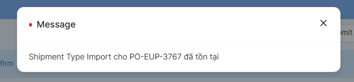 • Nếu Shipment với PO đã tồn tại thì sẽ hiển thị thông báo vd: "Shipment Type Import cho PO-EUP-3767 đã tồn tại" và không thể tạo.