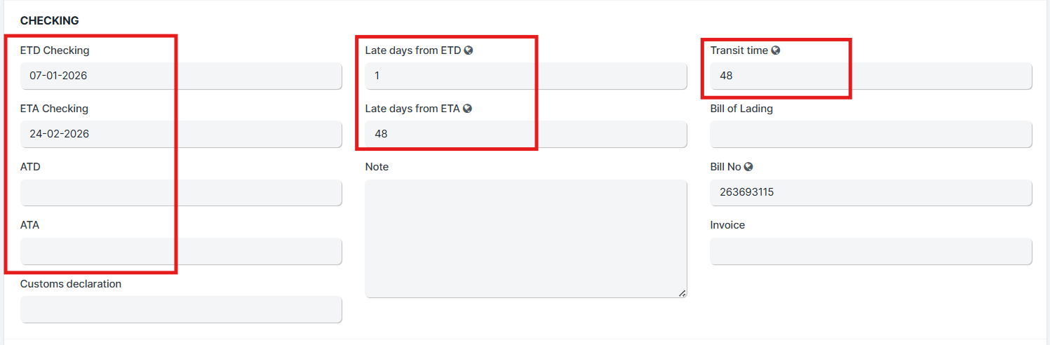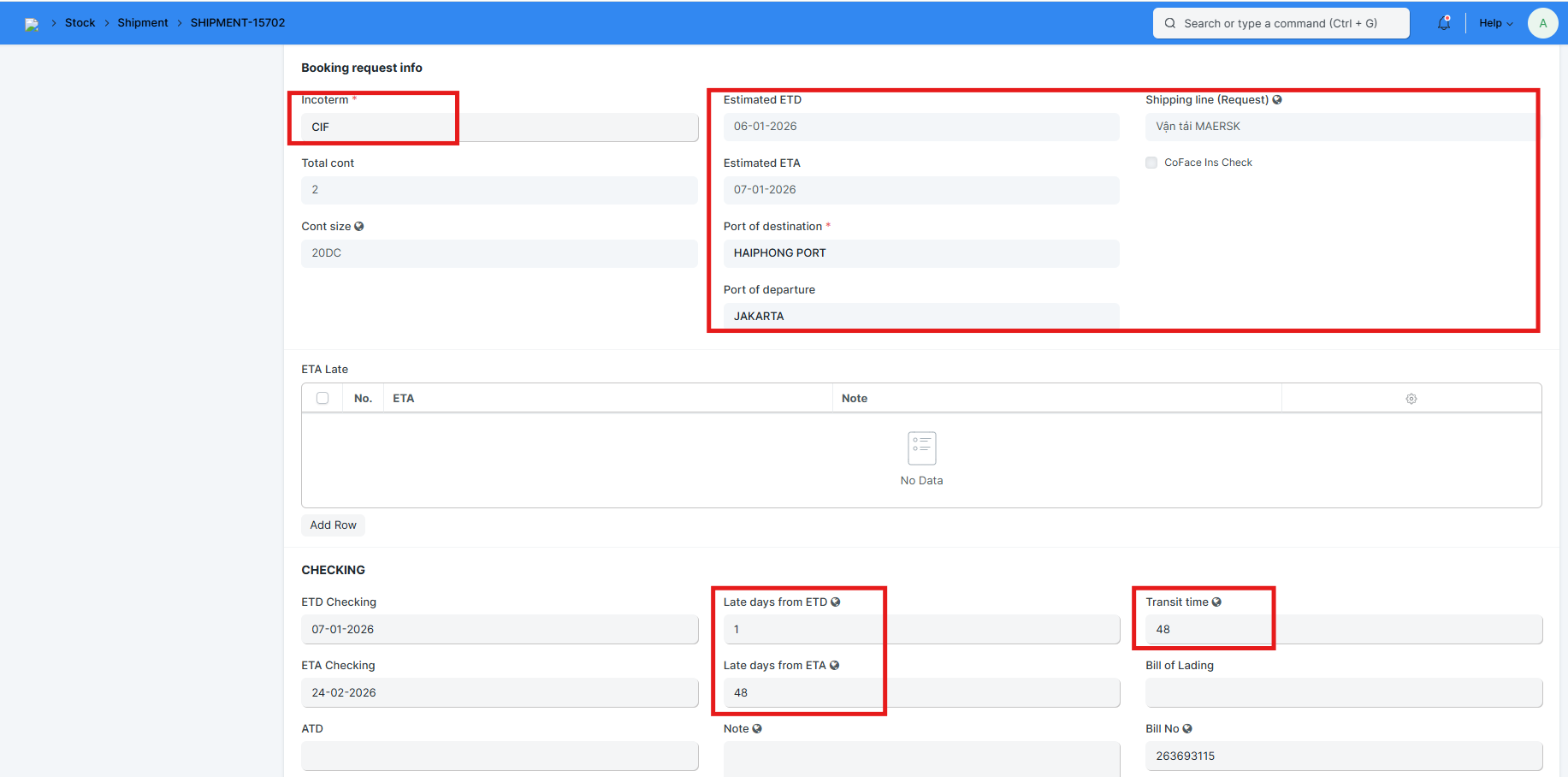 2 thông tin này nếu được điền thì sẽ cập nhật vào Shipment, và tính được Late days from ETD, Late days from ETA, Transit time