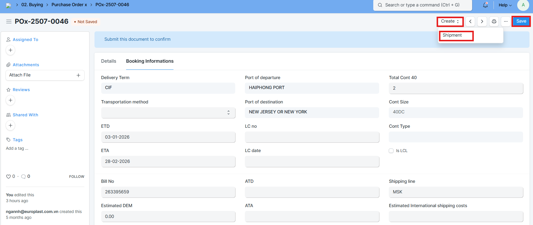 2.1.1 Tạo Shipment từ Purchase Order