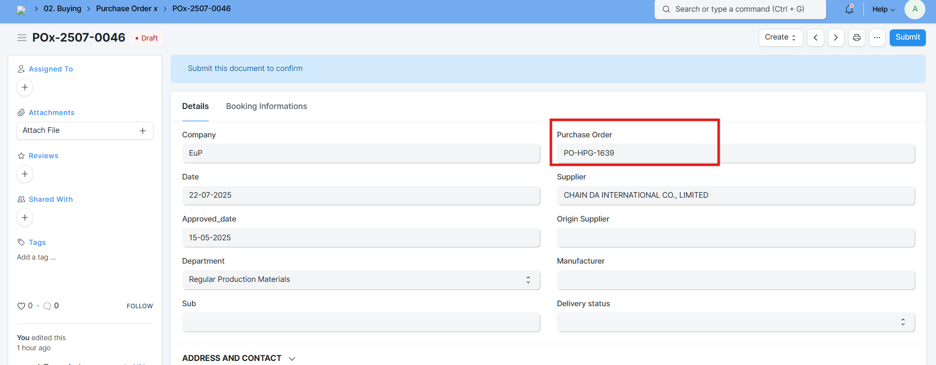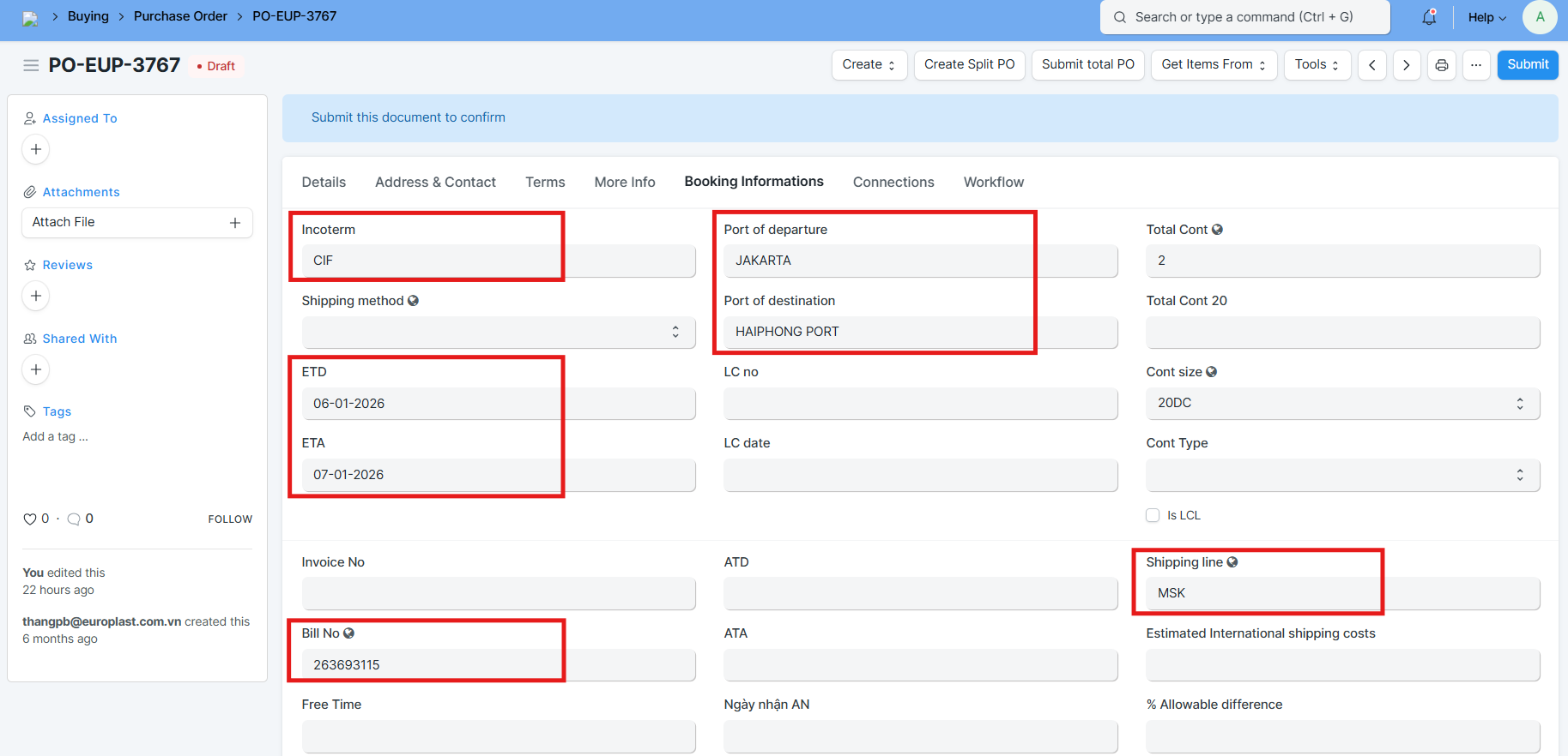 Bước 2: Mở 1 Purchase Order -> tab Booking informations