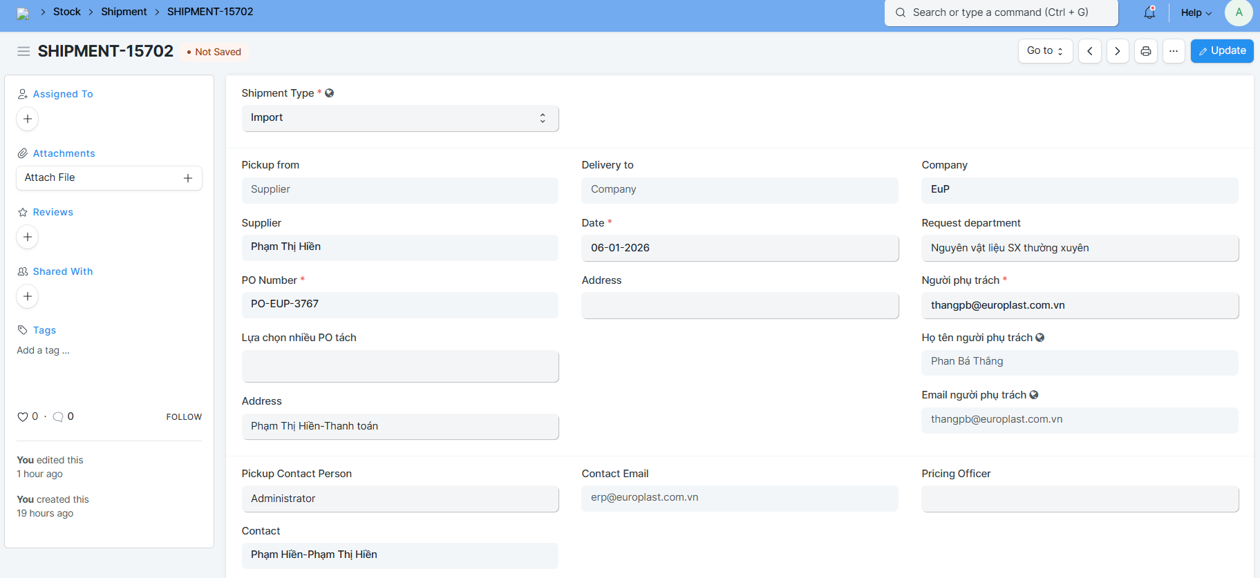 Bước 4: Cập nhật vào Shipment