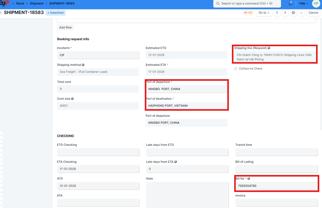 Checking ETA: Tên Shipment/Số P0/Số PO-x/Số Bill/Hãng tàu