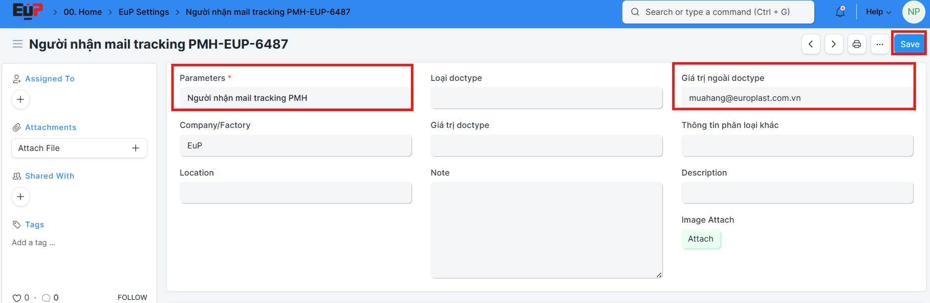 Giá trị ngoài doctype: nhập email của người muốn nhận thông báo