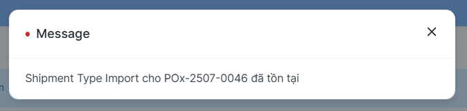 • Nếu Shipment với PO-x đã tồn tại thì sẽ hiển thị thông báo vd: "Shipment Type Import cho POx-2507-0046 đã tồn tại" và không thể tạo.