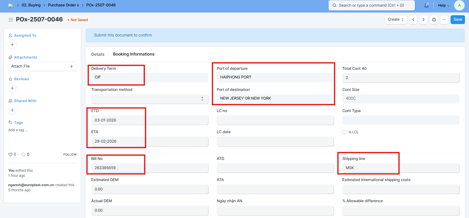 - Các thông tin khác: Khi nhập Bill No thì bắt buộc nhập ETD, ETA