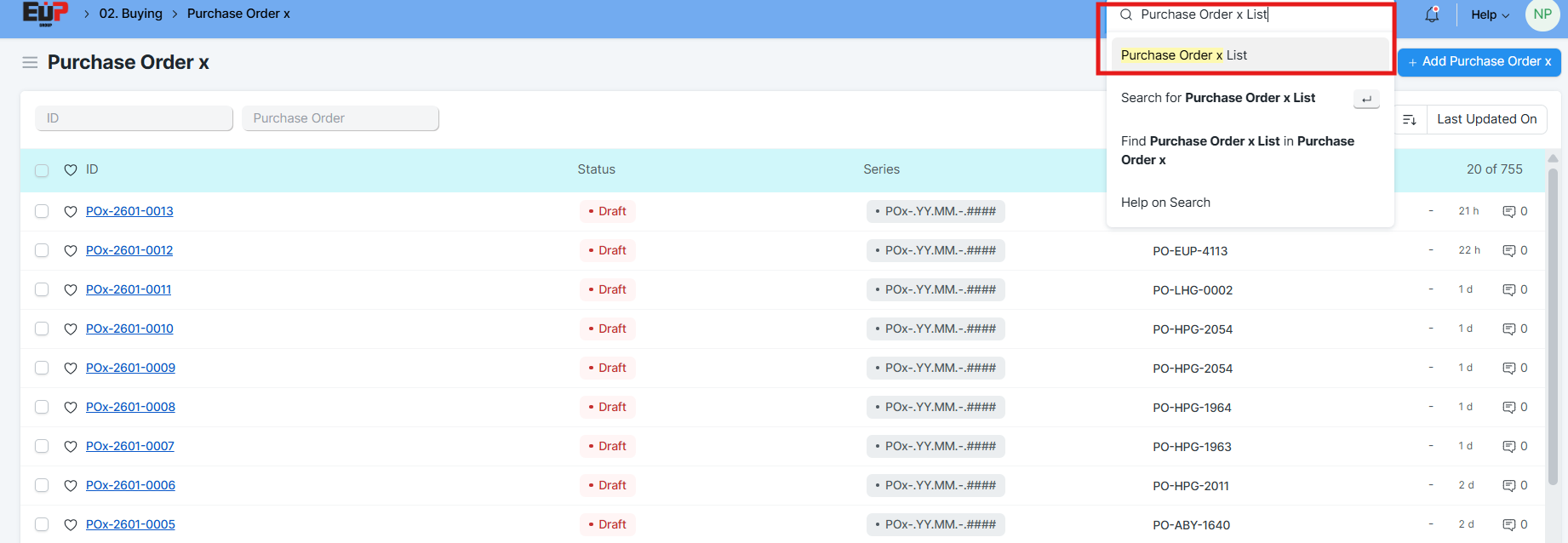 Bước 1: Truy cập vào doctype Purchase Order x