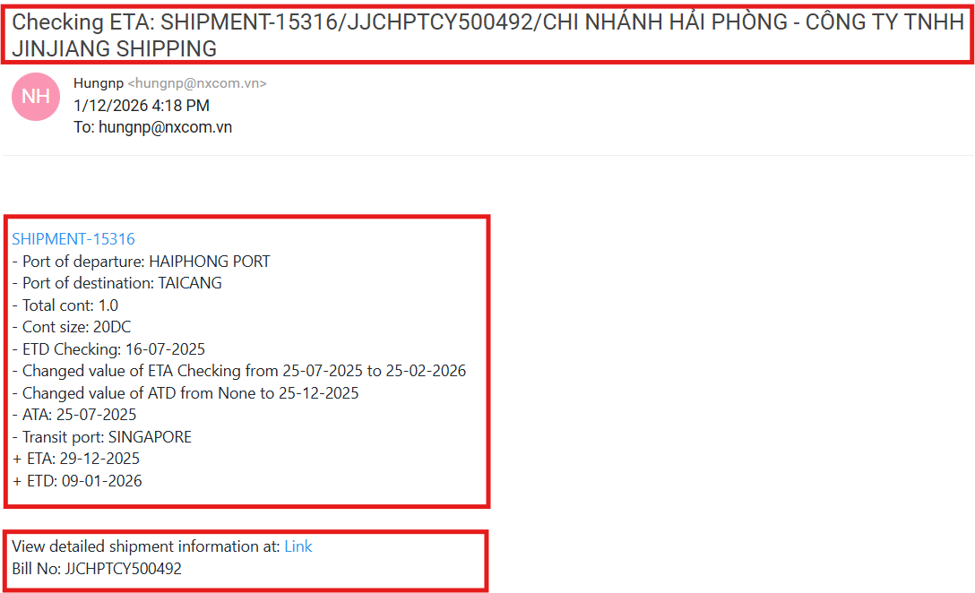 Bước 5: Gửi email thông báo thay đổi thời gian ETD, ETA cho gười được cấu hình trong mục 2.3 với :