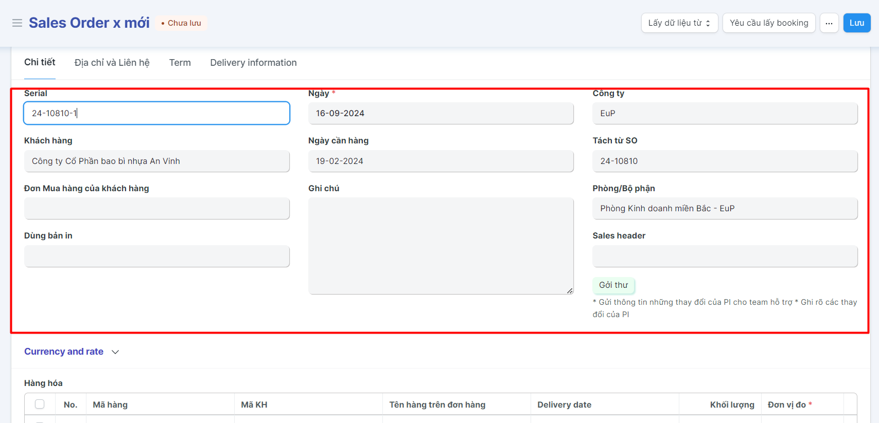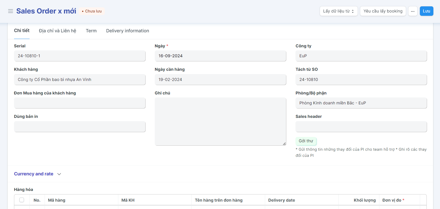 Bước 4: Kiểm tra các thông tin chung của đơn hàng tách (Các thông tin được kế thừa từ Đơn hàng gốc); Kiểm tra và điều chỉnh thông tin hàng hóa của bảng hàng hóa;
