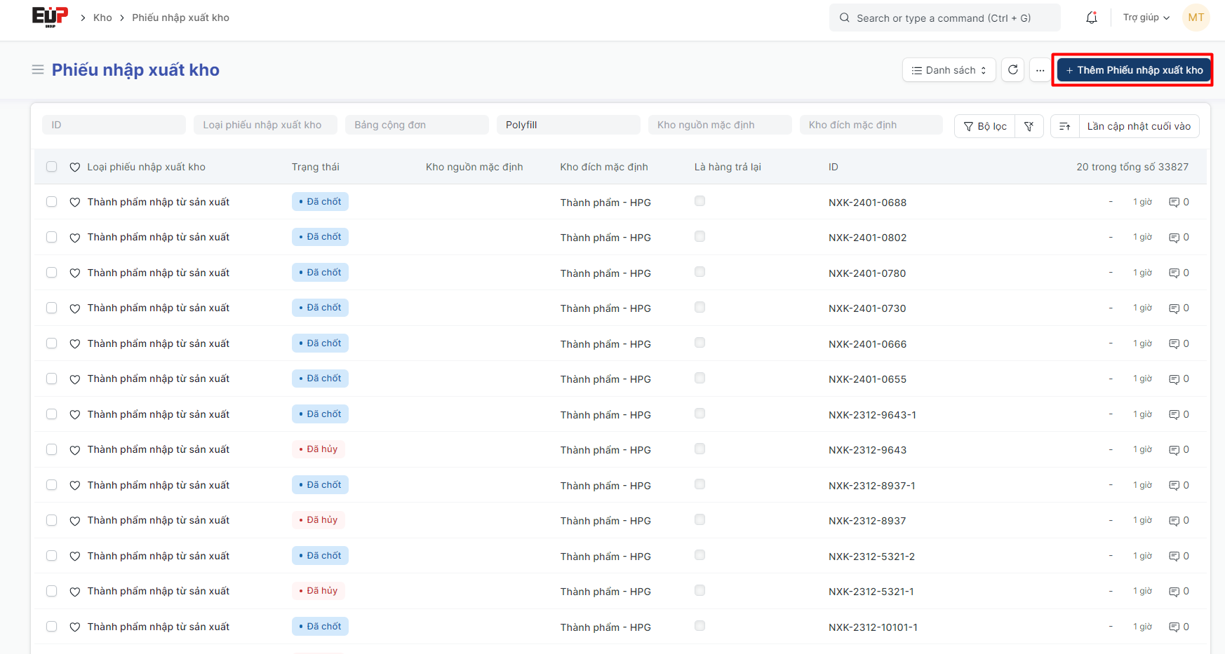 Bước 2: Bấm "Thêm phiếu nhập xuất kho":