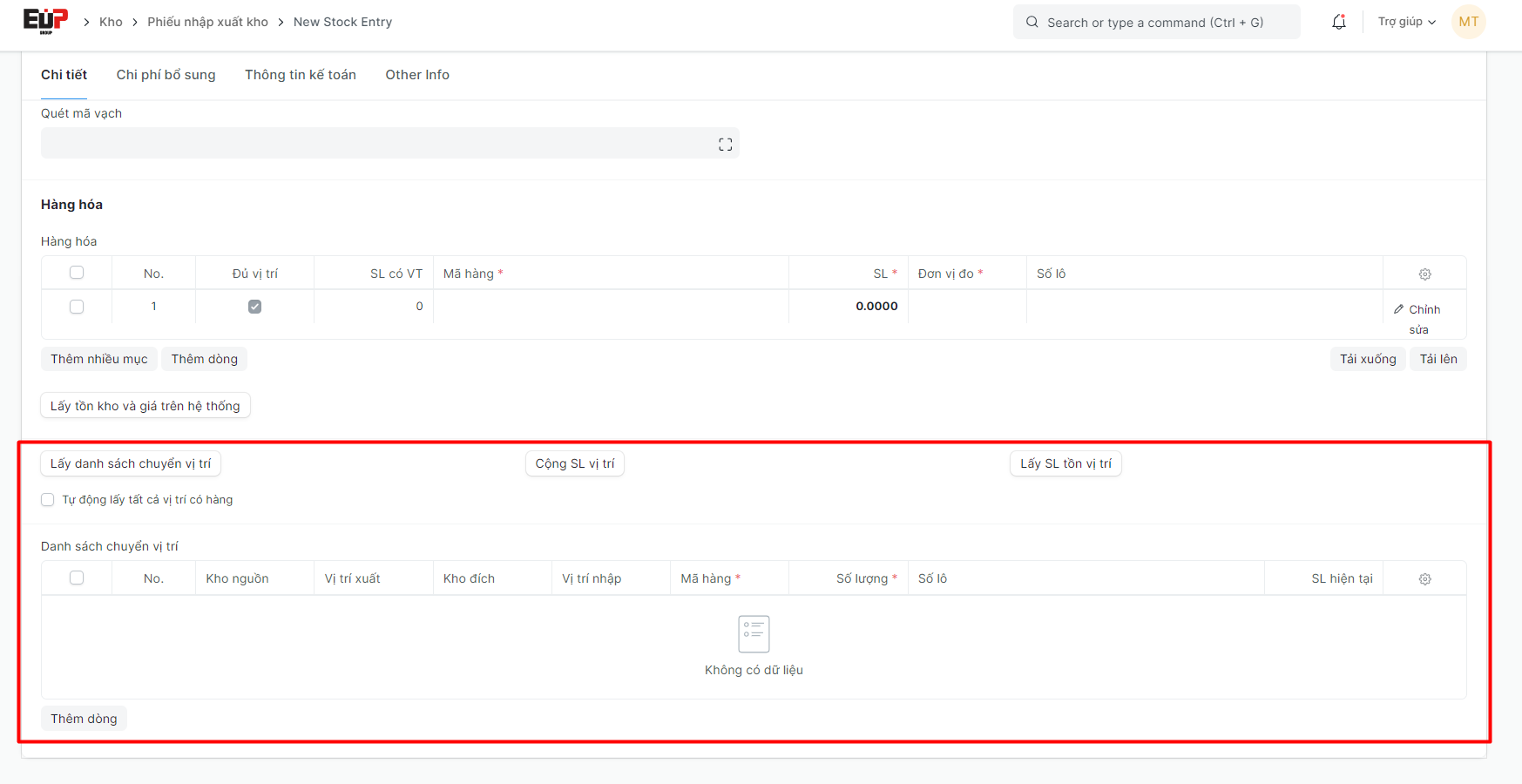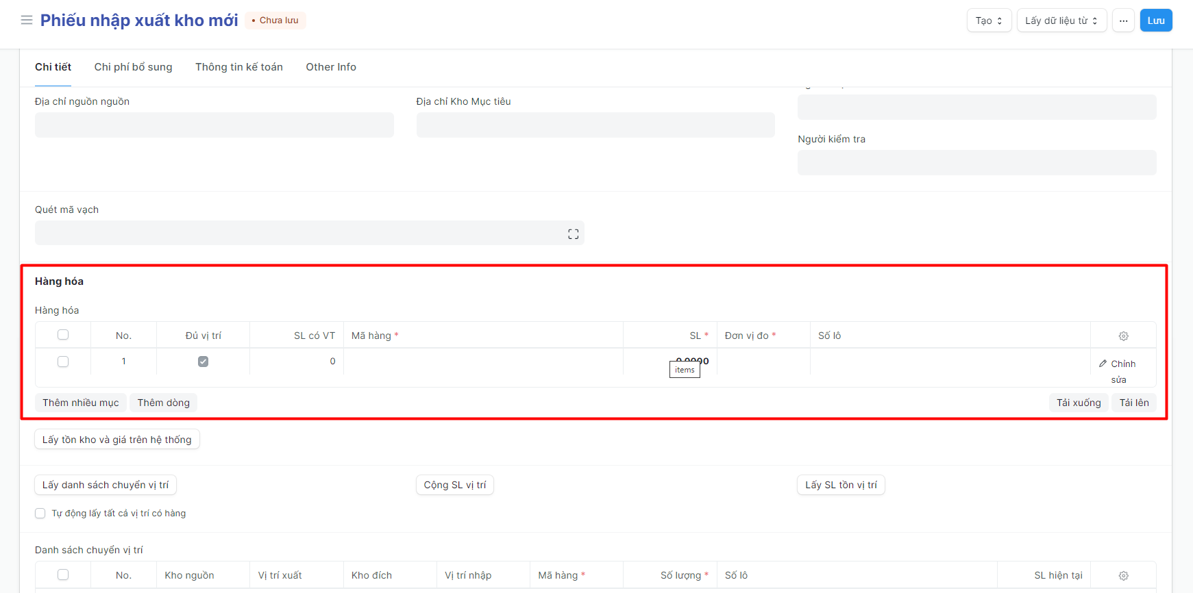 Bước 7: Bấm nút: "Lấy danh sách chuyển vị trí" để nhập thông tin vị trí của hàng hóa nếu Kho mặc định có bắt buộc nhập vị trí;
