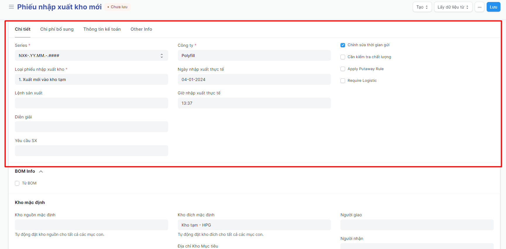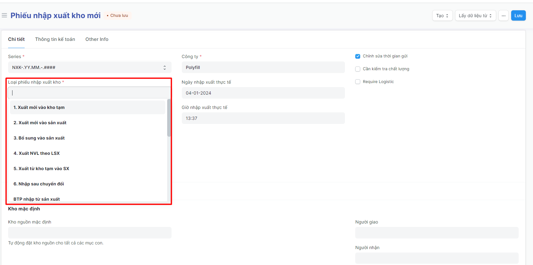 • Chỉnh sửa ngày giờ thực tế: khi tích vào đây thì có thể chỉnh sửa ngày/giờ nhập xuất thực tế của phiếu;
