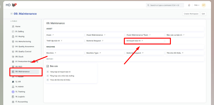 Bước 1: Tại mục 09.KT thiết bị - bảo trì chọn shortcut Kế hoạch bảo trì