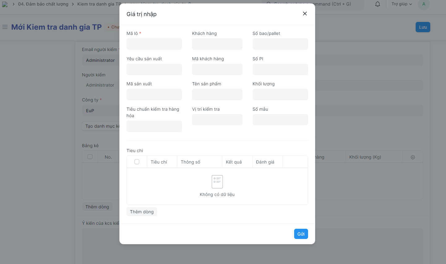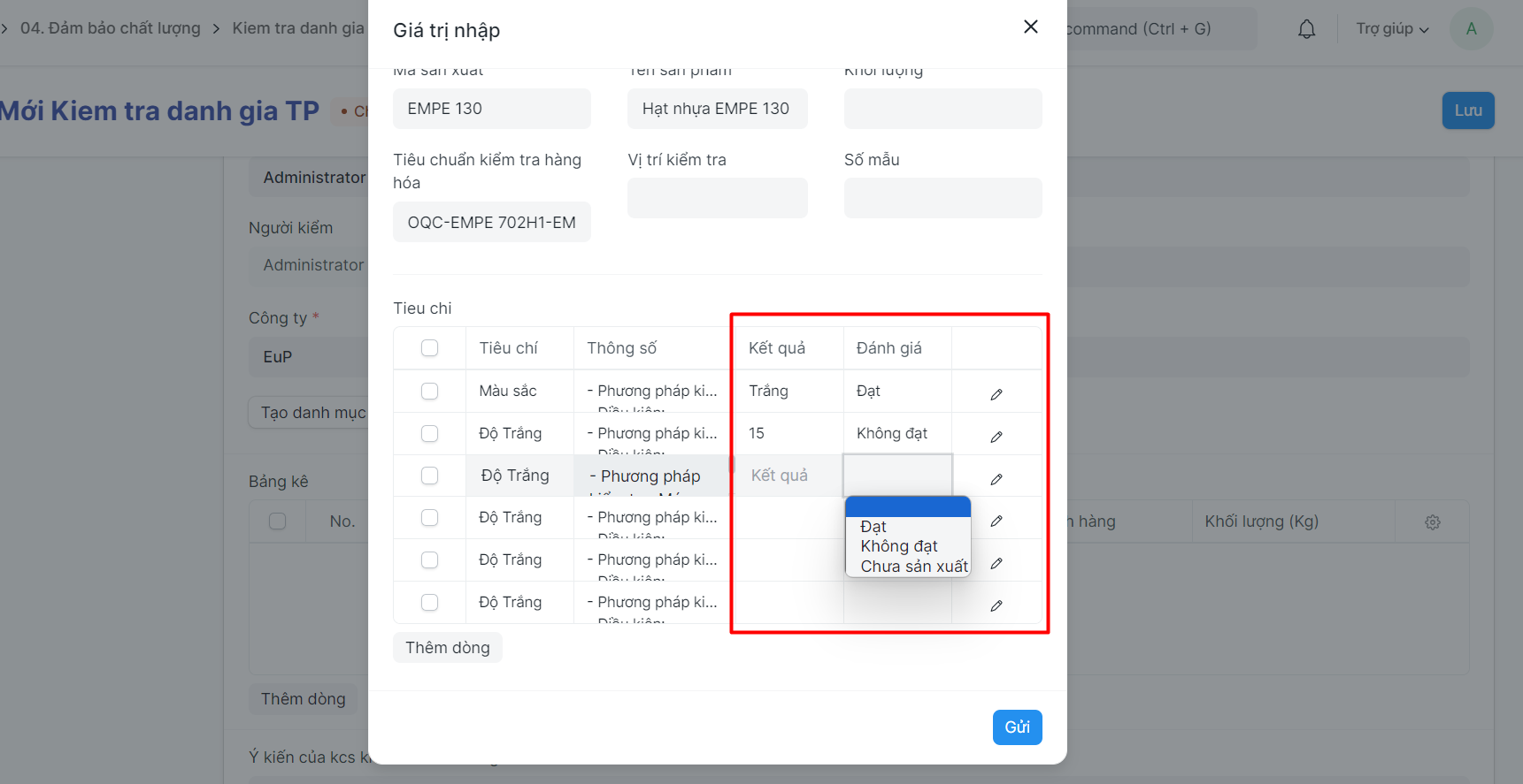 Bước 7: sau khi nhập xong kết quả và đánh giá từng tiêu chí, kiểm tra lại các thông tin, sau đó bấm "Gửi". Hệ thống sẽ lưu lại các thông tin vừa nhập vào bảng kê: