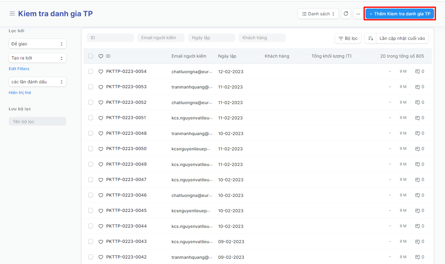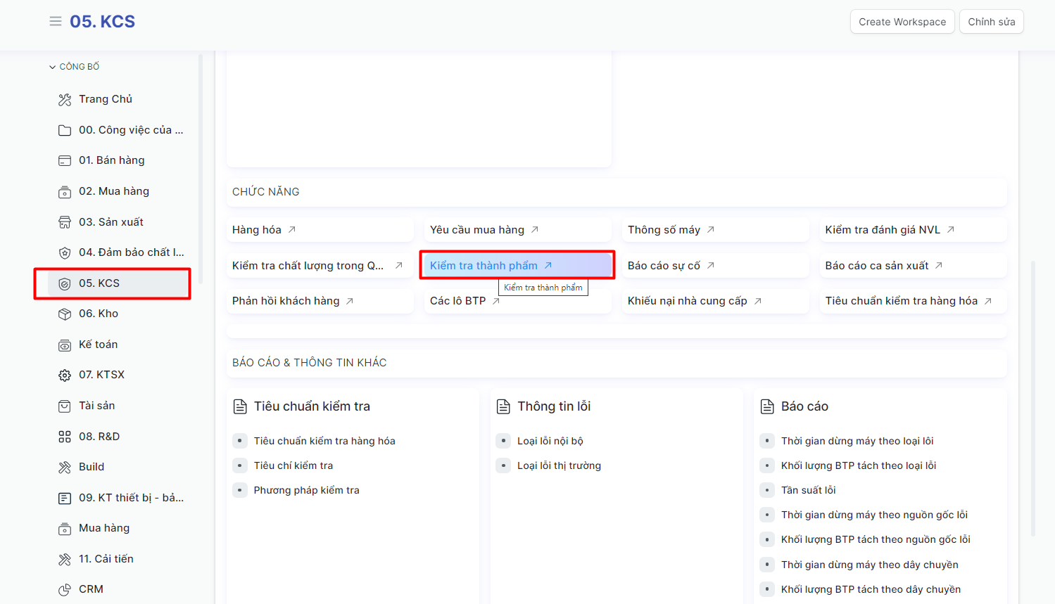 Bước 1: Truy cập vào: Trang chính > KCS > Kiểm tra đánh giá Thành phẩm;