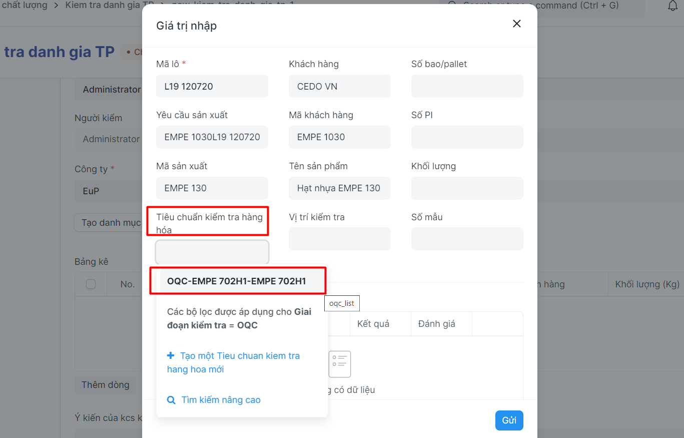 Bước 5: Chọn Tiêu chuẩn kiểm tra hàng hóa, hệ thống sẽ lấy ra các tiêu chuẩn kiểm tra hàng hóa đã được tạo cho mã hàng được chọn:
