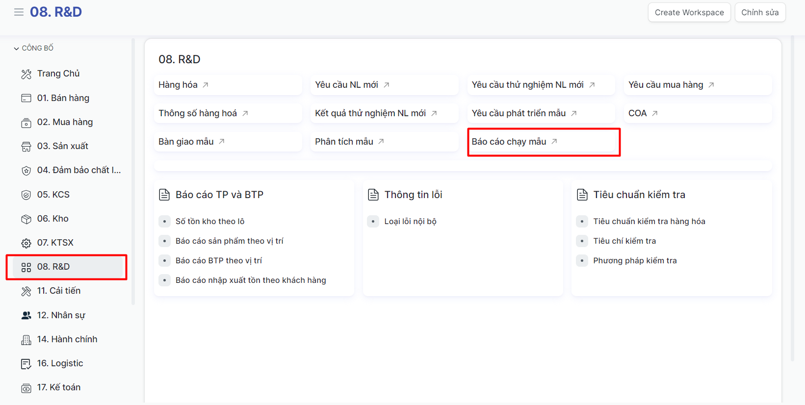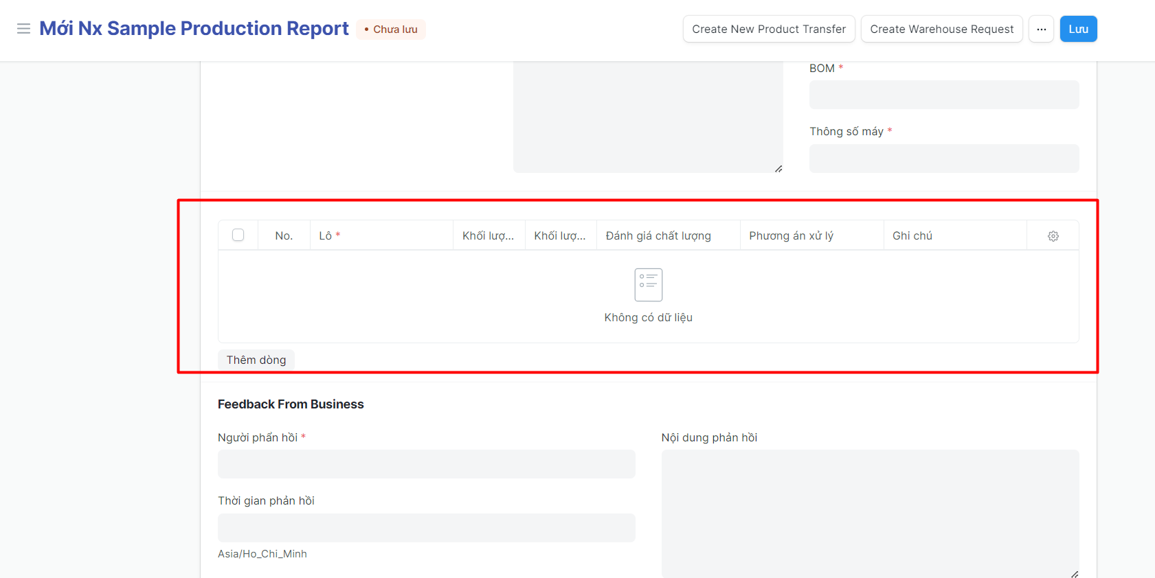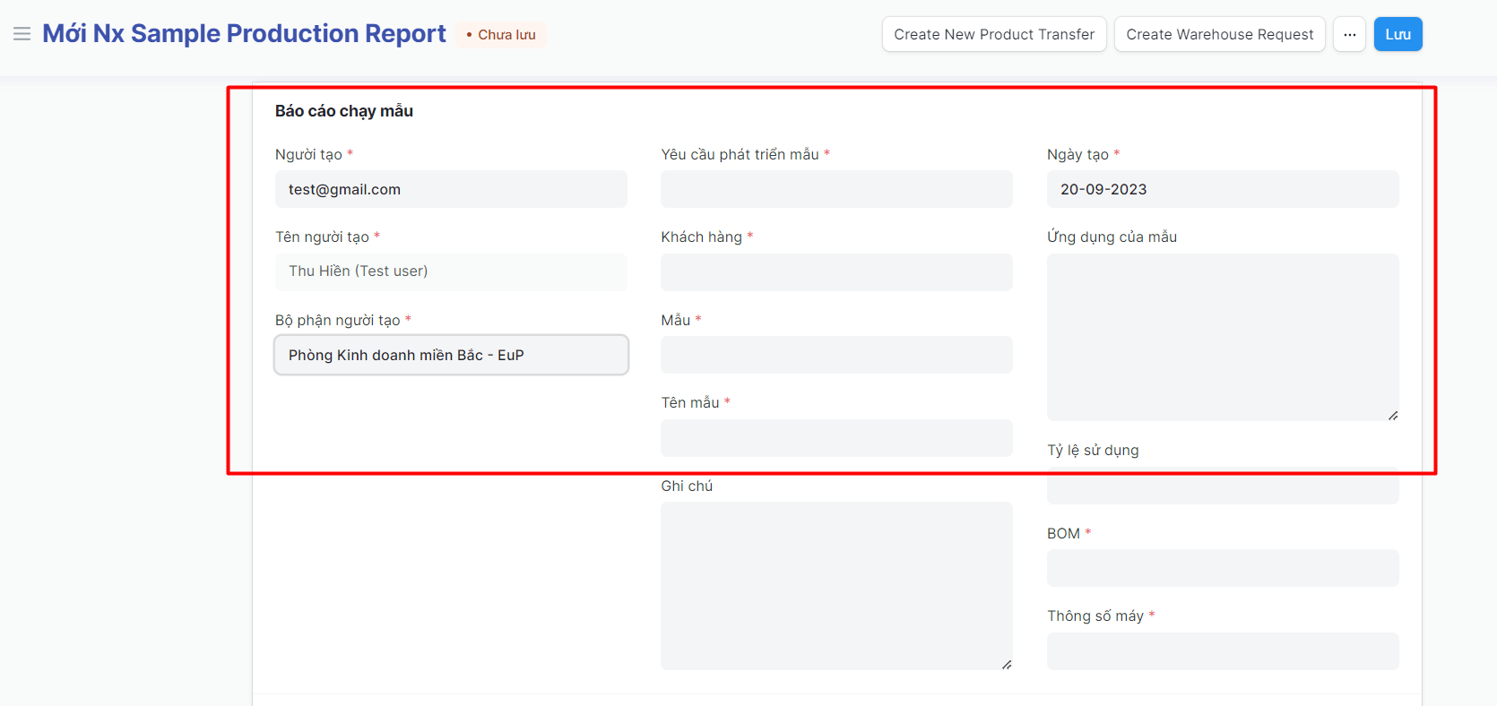 Phiếu báo cáo chạy mẫu là chức năng trên hệ thống ERP cho phép nhân viên phát triển sản phẩm ghi nhận kết quả chạy mẫu bao gồm: BOM chốt, thông số máy chốt, Khối lượng và phương án xử lý bán thành phẩm sinh ra trong quá trình phát triển sản phẩm;