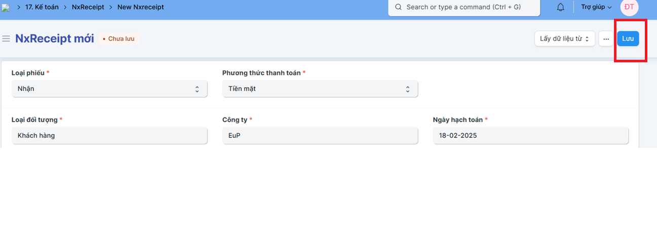 Bước 4: Bấm Lưu để lưu Phiếu thu tiền mặt hoặc phiếu thu tiền gửi ngân hàng vừa mới tạo