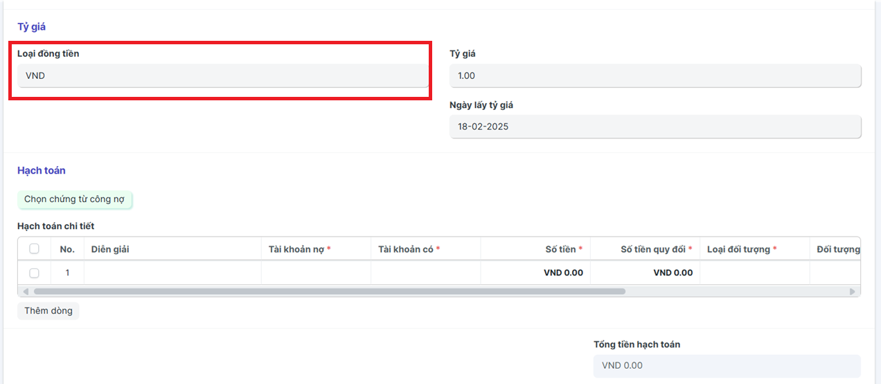 Bước 3: Nhập loại tiền tệ và hạch toán chi tiết