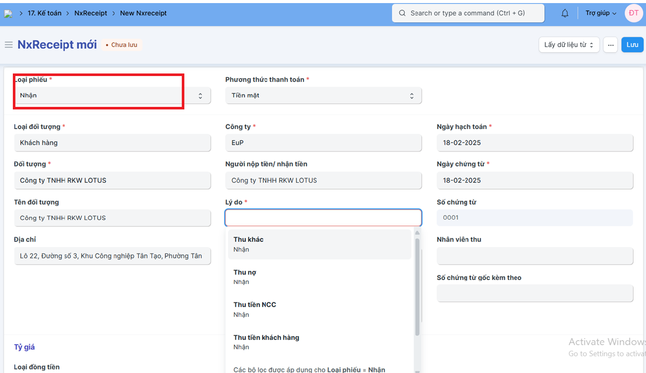 Nhập Loại phiếu và các thông tin yêu cầu: