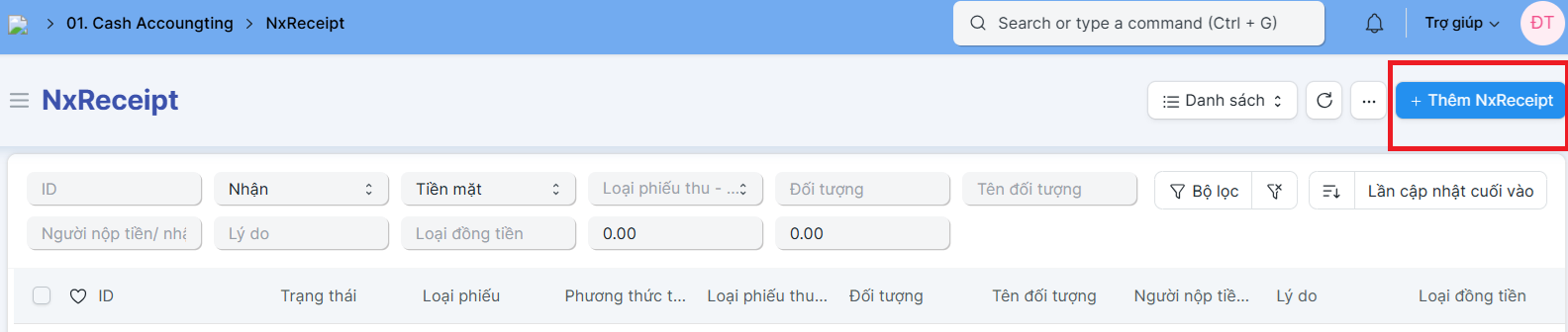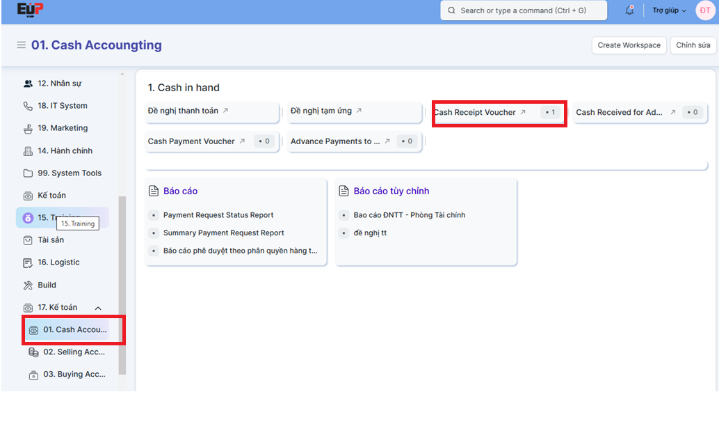 Bước 1: Truy cập ERP tạo phiếu thu theo hướng dẫn : Trang chính-> 17. Kế toán-> Cash Accounting-> Cash Receipt Voucher