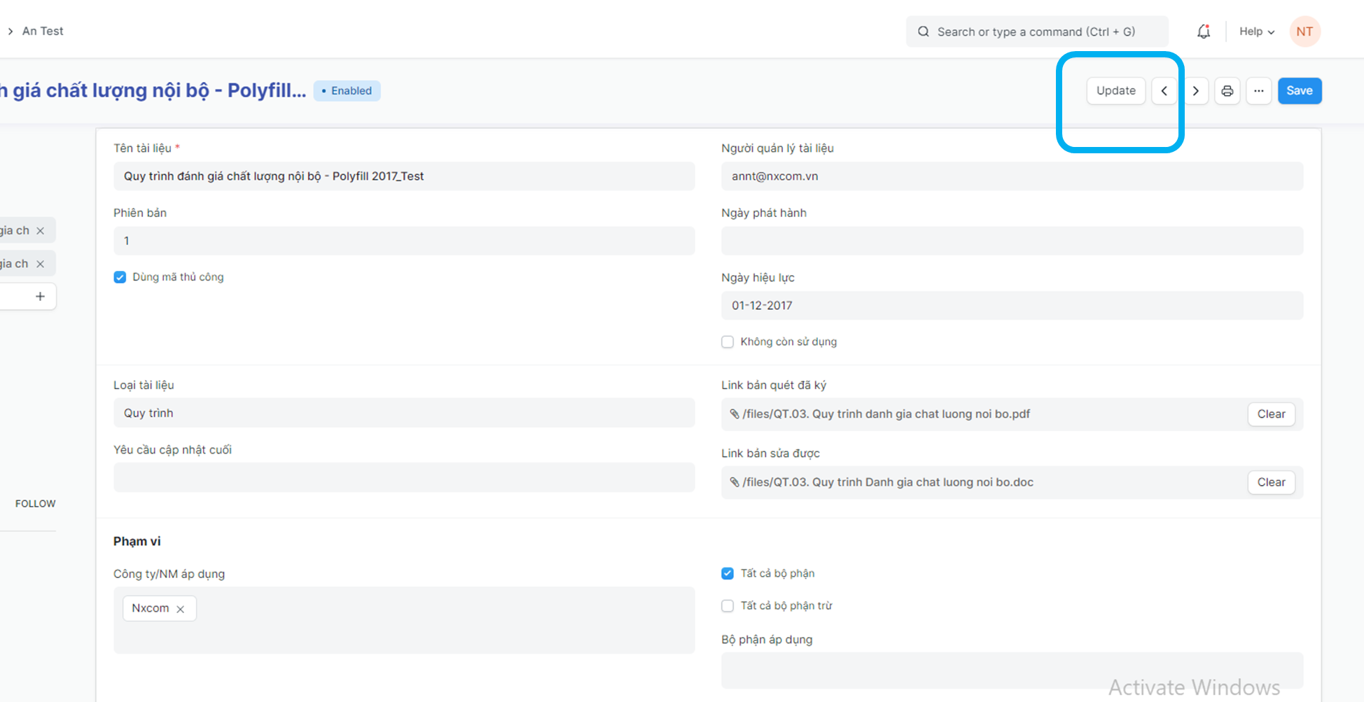 Hoặc từ giao diện của tài liệu có sẵn: Bấm vào nút Update