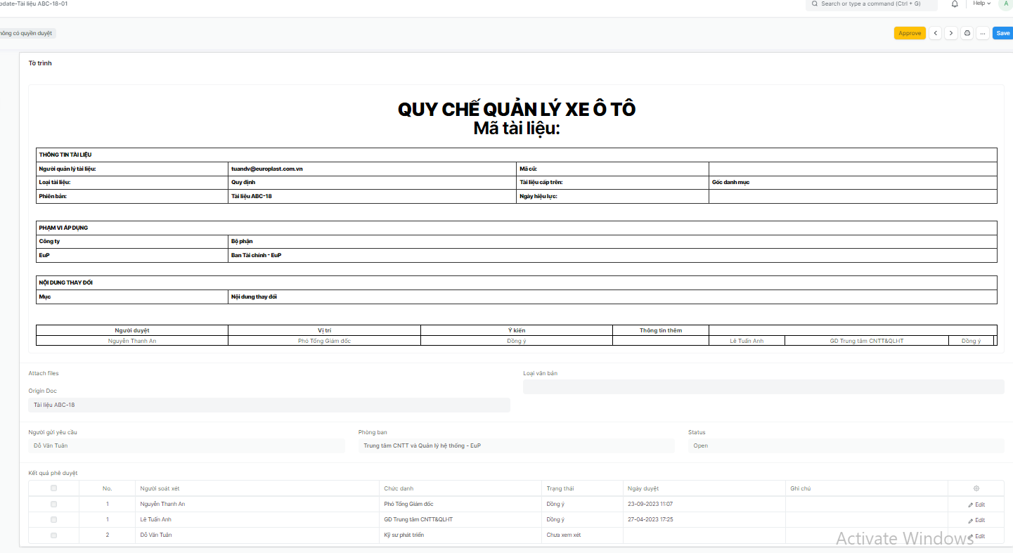 Giao diện khi đăng nhập theo link nhận được của người quản lý >> Bấm vào nút Approve để thực hiện phê duyệt
