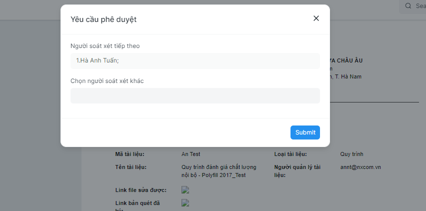 Hệ thống sẽ tự động lấy danh sách soát xét là trưởng các bộ phận liên quan. Người ở cấp cuối cùng là người có quyền phê duyệt. Người có quyền phê duyệt phải được thiết lập sẵn là người sẽ có quyền chốt phiếu.