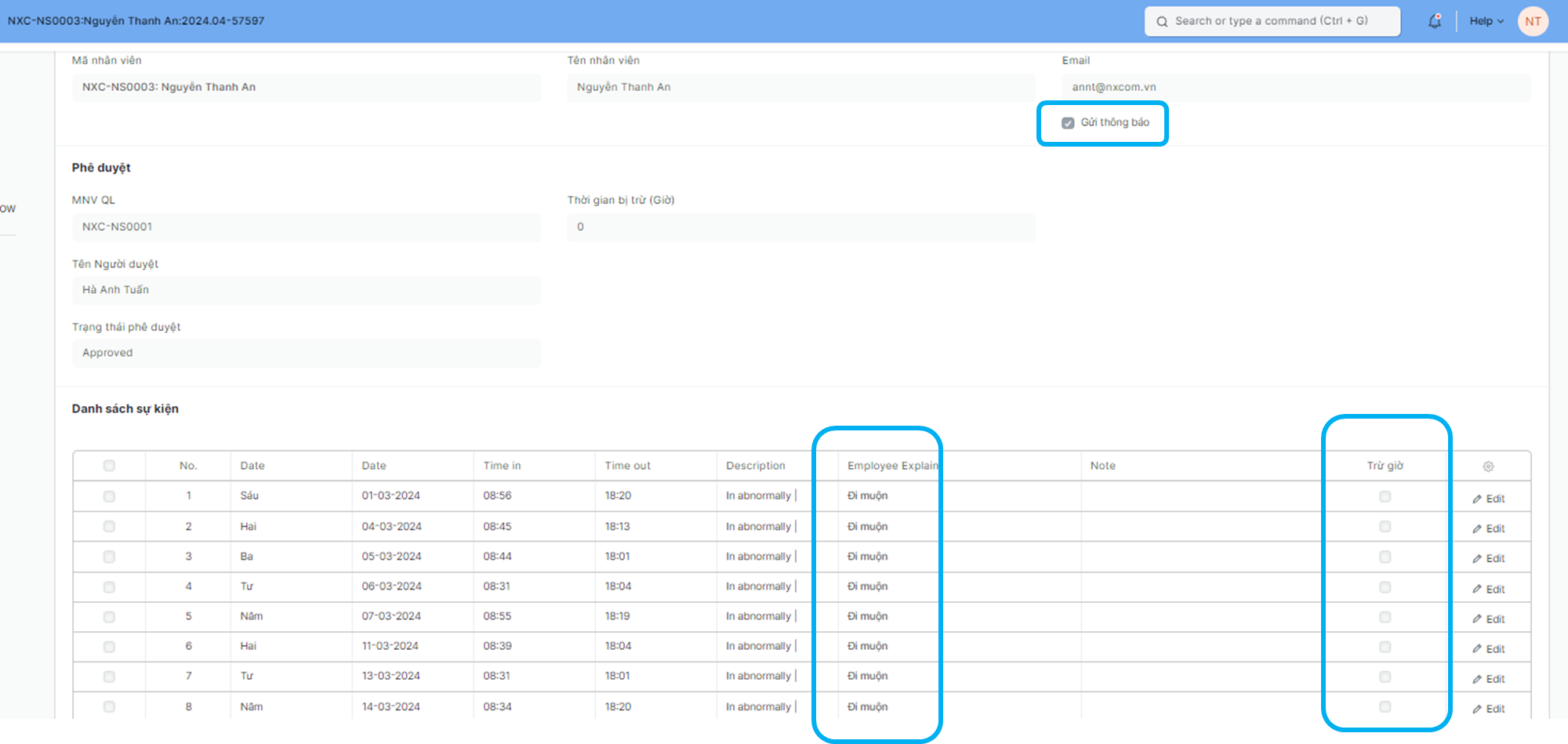 Ở cột trừ giờ, quản lý khi phê duyệt sẽ tích chọn quyết định trừ giờ ngày nào.