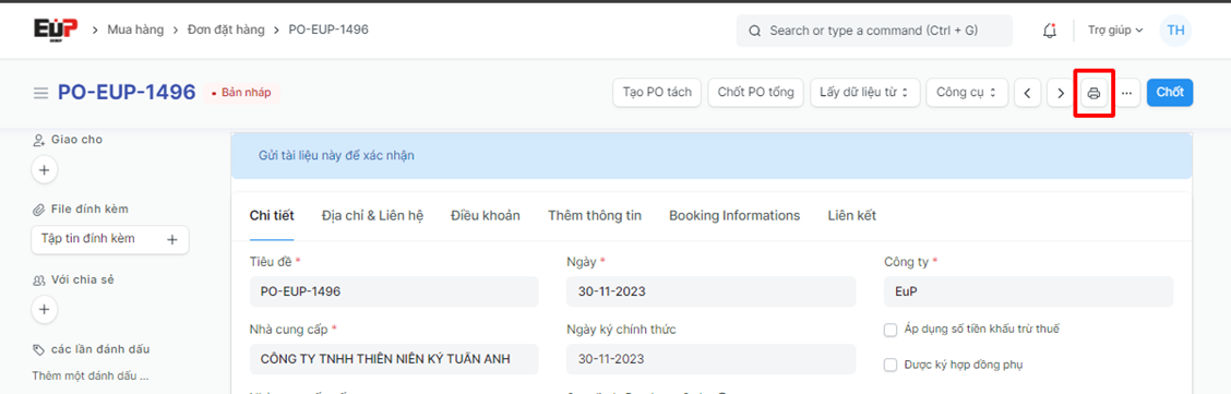 Bước 10: Kiểm tra lại đơn và bấm “Chốt” để chốt thông tin Đơn đặt hàng => Bấm “Gởi thư” để gửi mail thông báo đến các bên liên quan: