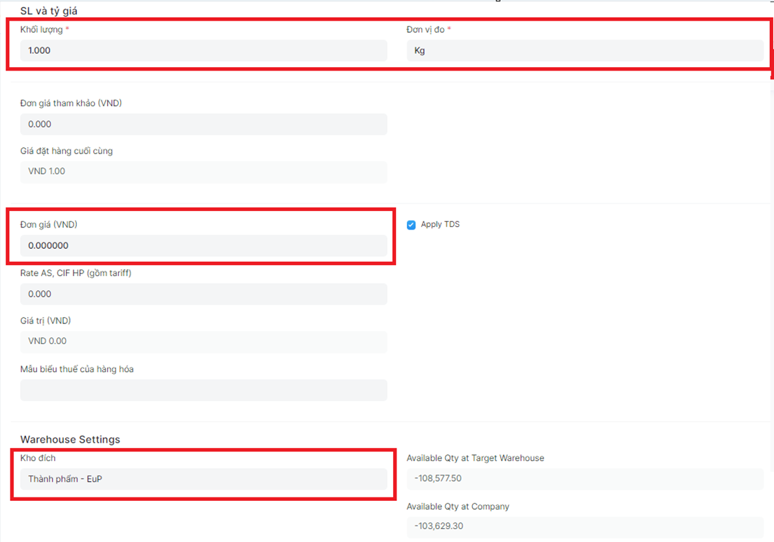 Điền Số lượng, Đơn giá, Kho nhận hàng,…